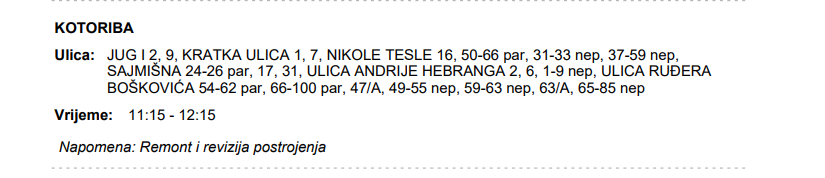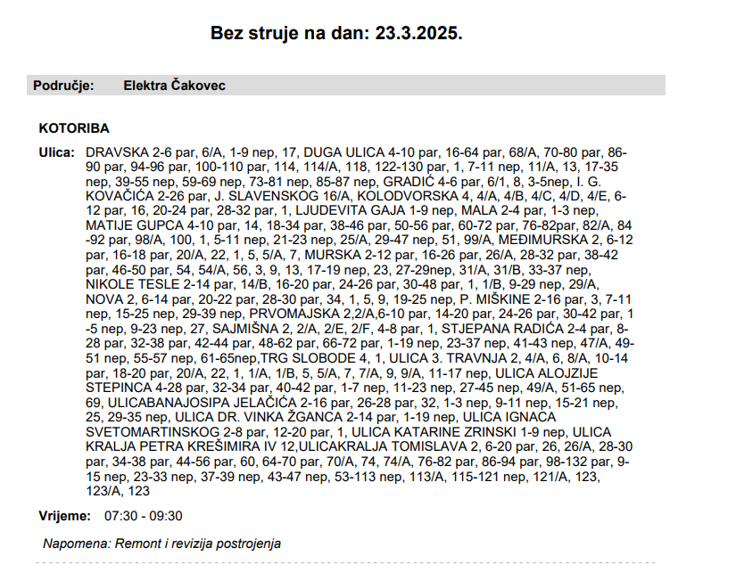 Iz HEP-a javljaju da električne energije 23. ožujka neće biti u Kotoribi: