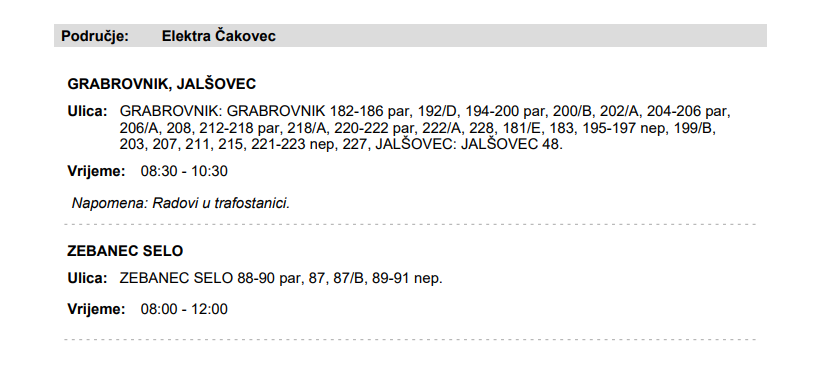 Iz HEP-a javljaju da 23. srpnja električne energije neće biti u Grabrovniku, naselju Jalšovec i Zebanec Selu.