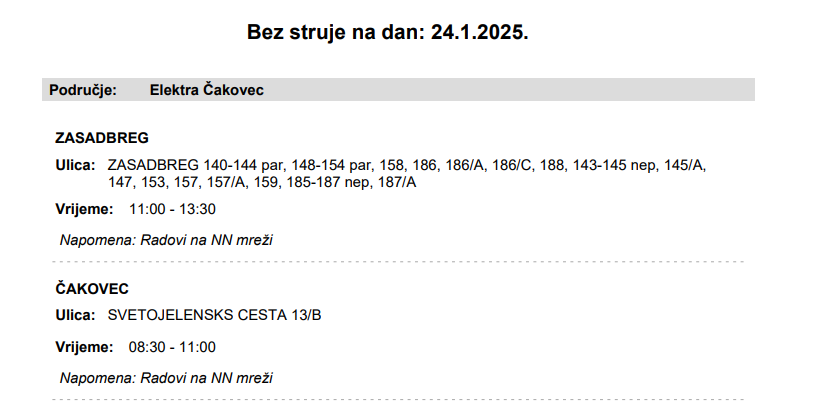 Iz elektre Čakovec javljaju da 24. siječnja električne energije neće biti u Zasadbregu i u jednoj ulici u Čakovcu: