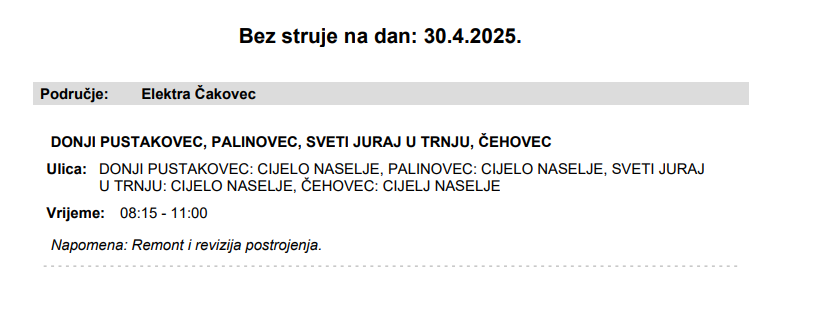 Iz Elektre Čakovec javljaju da električne energije 30. travnja neće biti u Donjem Pustakovcu, Palinovcu, Svetom Juraju u Trnju i Čehovcu:
