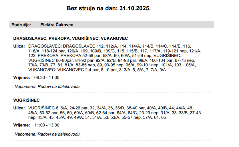 Iz Elektre Čakovec javljaju da električne energije 31. listopada neće biti u Dragoslavcu, Prekopi, Vugrišincu i Vukanovcu.