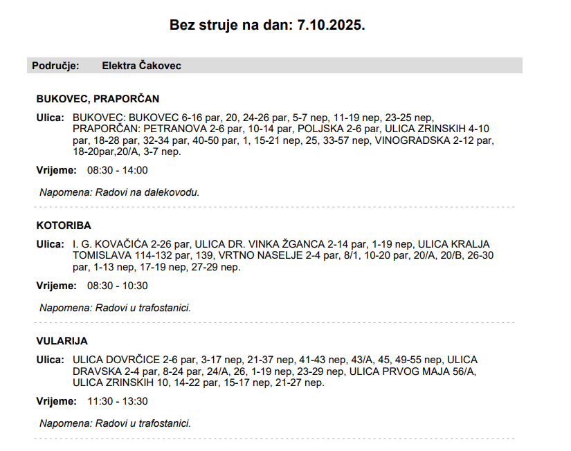 Iz Elektre Čakovec javljaju da 7. listopada električne energije neće biti u Bukovcu, Praporčanu, Kotoribi i Vulariji.