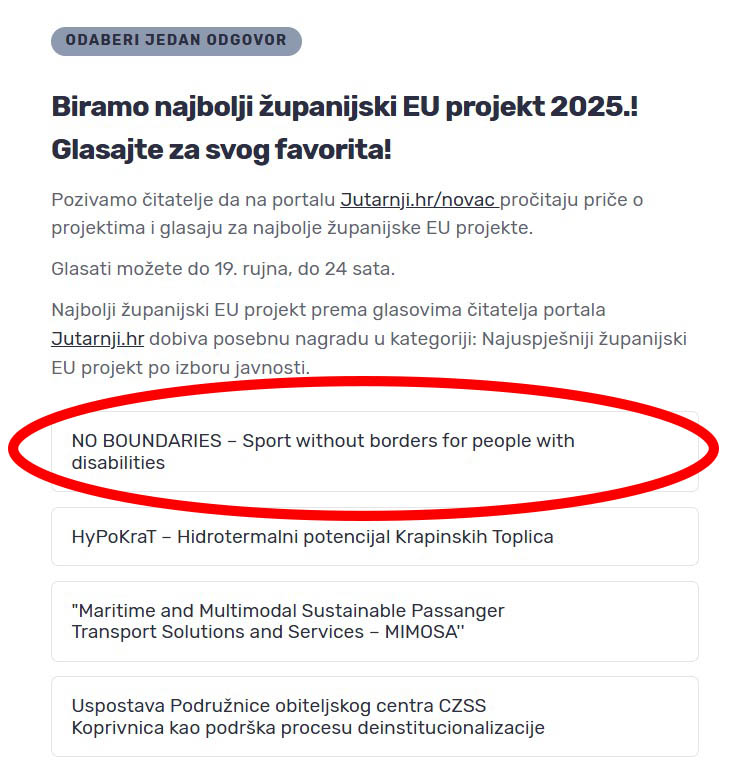 • NO BOUNDARIES – projekt kojim se Međimurska županija istaknula kao uključiva sredina sa snažno razvijenom mrežom skrbi za najranjivije članove zajednice. Tijekom niza sportskih i rekreativnih aktivnosti, stotine osoba s invalidnošću i volontera bilo je uključeno u programe koji povezuju sudionike i otvaraju vrata daljnje suradnje u zajednici.