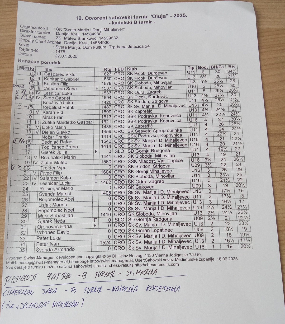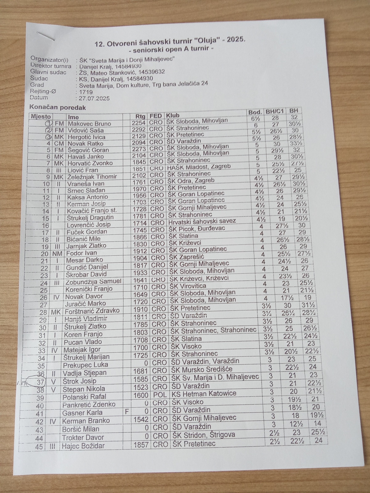 U nedjelju, 27. srpnja 2025. godine, u Domu kulture u Svetoj Mariji održan je 12. Otvoreni šahovski turnir „Oluja“,koji je okupio rekordan broj od stotinjak šahista ne samo iz Međimurja i Hrvatske, već i iz Poljske i Slovenije!
