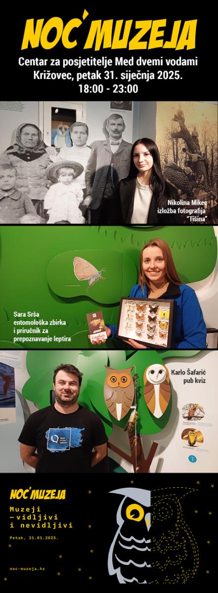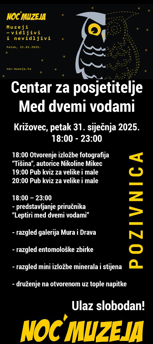 Glavna tema ovogodišnje Noći muzeja glasi „MUZEJI – VIDLJIVI I NEVIDLJIVI‟. Centar Med dvemi vodami predstavit će također svoje entomološke zbirke gdje će se moći opaziti leptir šahovnica, japansko noćno paunče i leptir poštar. Veliki i mali posjetitelji moći će se zabaviti uz pub kviz s početkom u 19 i 20 sati, a najbolji znalci bit će nagrađeni prigodnim nagradama. Svi zainteresirani moći će uz pomoć mikroskopa razgledati preparate iz histološke edukativne zbirke, primjerice kukce, krvne stanice, polen biljaka, ljuskice leptira…