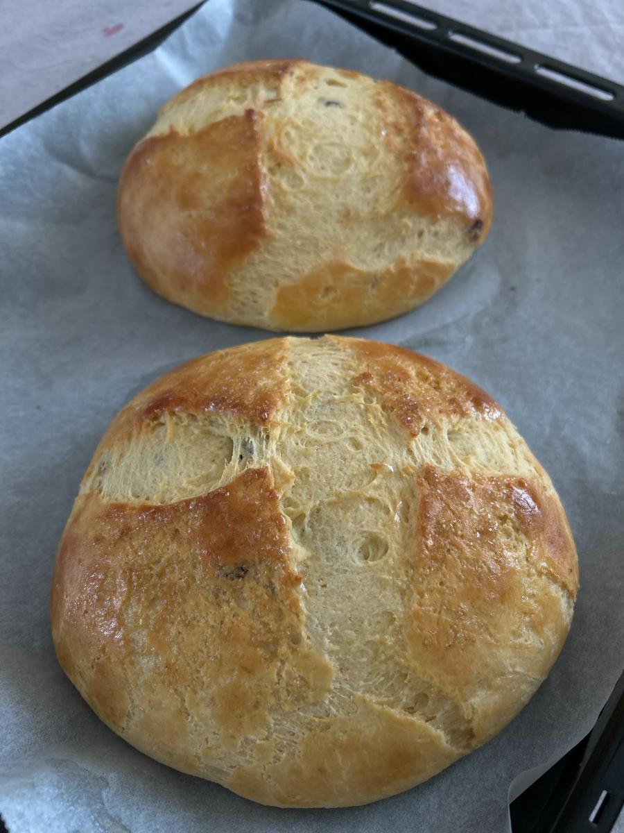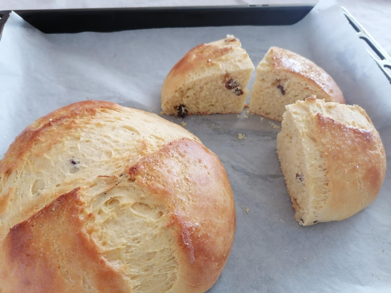 Kuglu premažite bjelanjkom i posipajte šećerom. Na sredini škarama zarežite znak križa. Pecite na 180 °C oko 30 do 35 minuta.