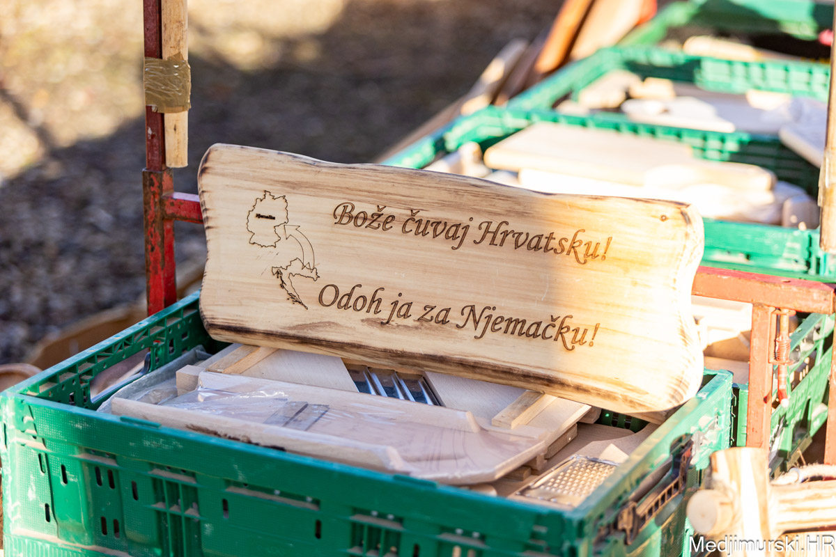 Na dijelu sajma gdje se prodaju drveni proizvodi posebno je u oči upadala ukrasna daska s porukom: “Bože čuvaj Hrvatsku, odoh ja za Njemačku!”.