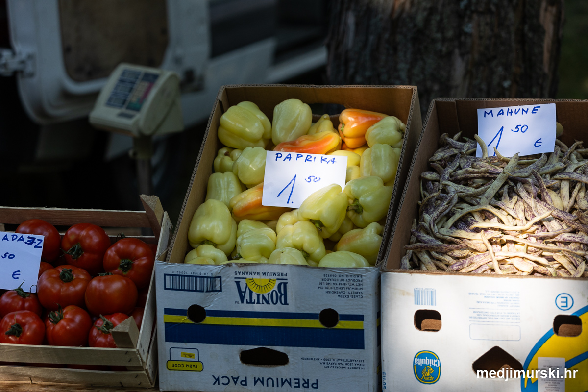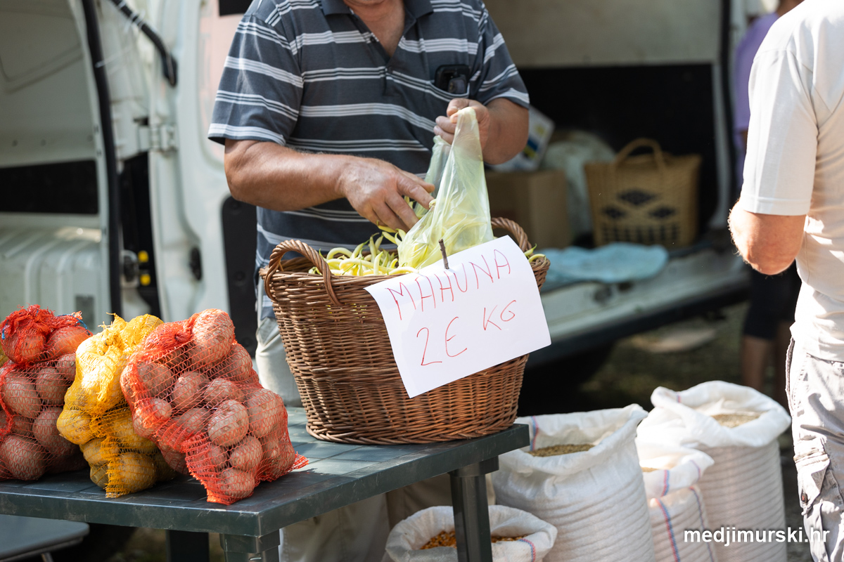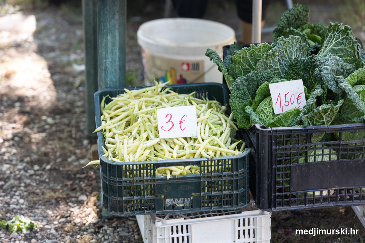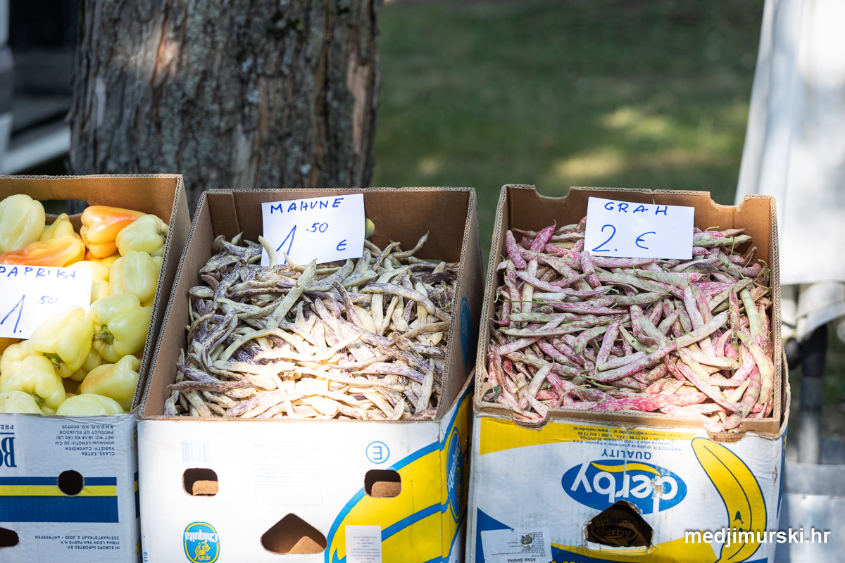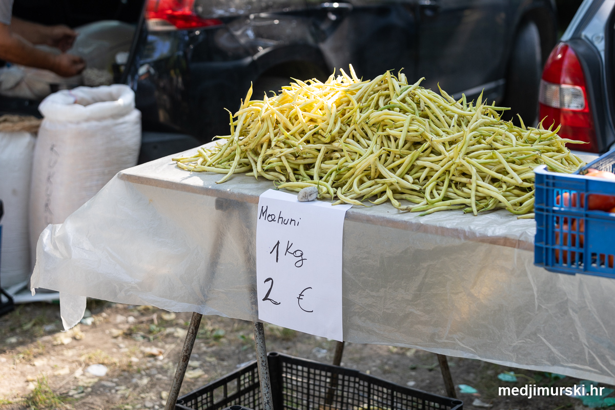 Da, da, cijene poljoprivrednih proizvoda na čakovečkom sajmu osjetno su pale u odnosu na prošlu srijedu. Mladi grah čak je upola jeftiniji. Neočišćen u vrećama prodavan je po 2 eura kilogram, a očišćen 5 eura kg. To je ista cijena kao i prošle godine.