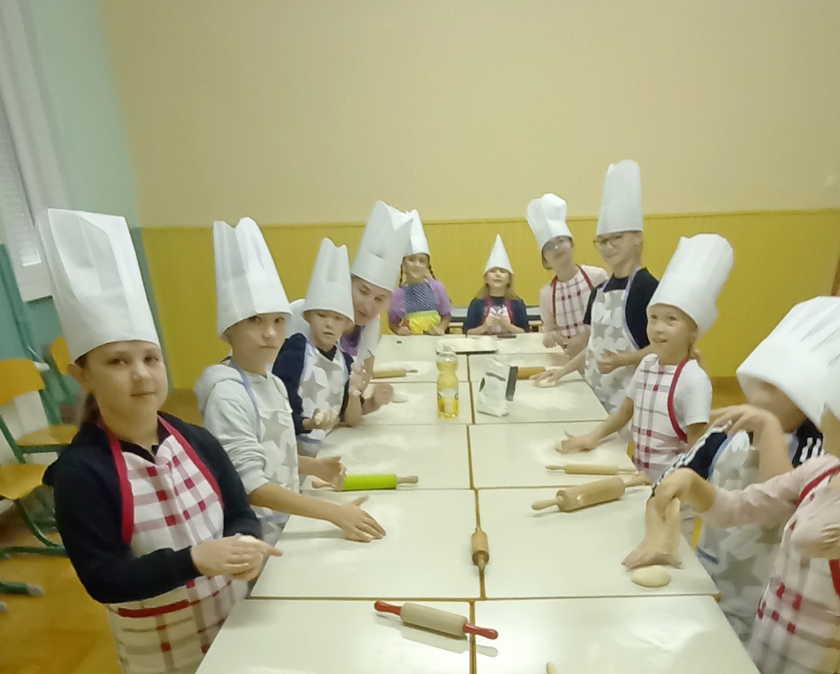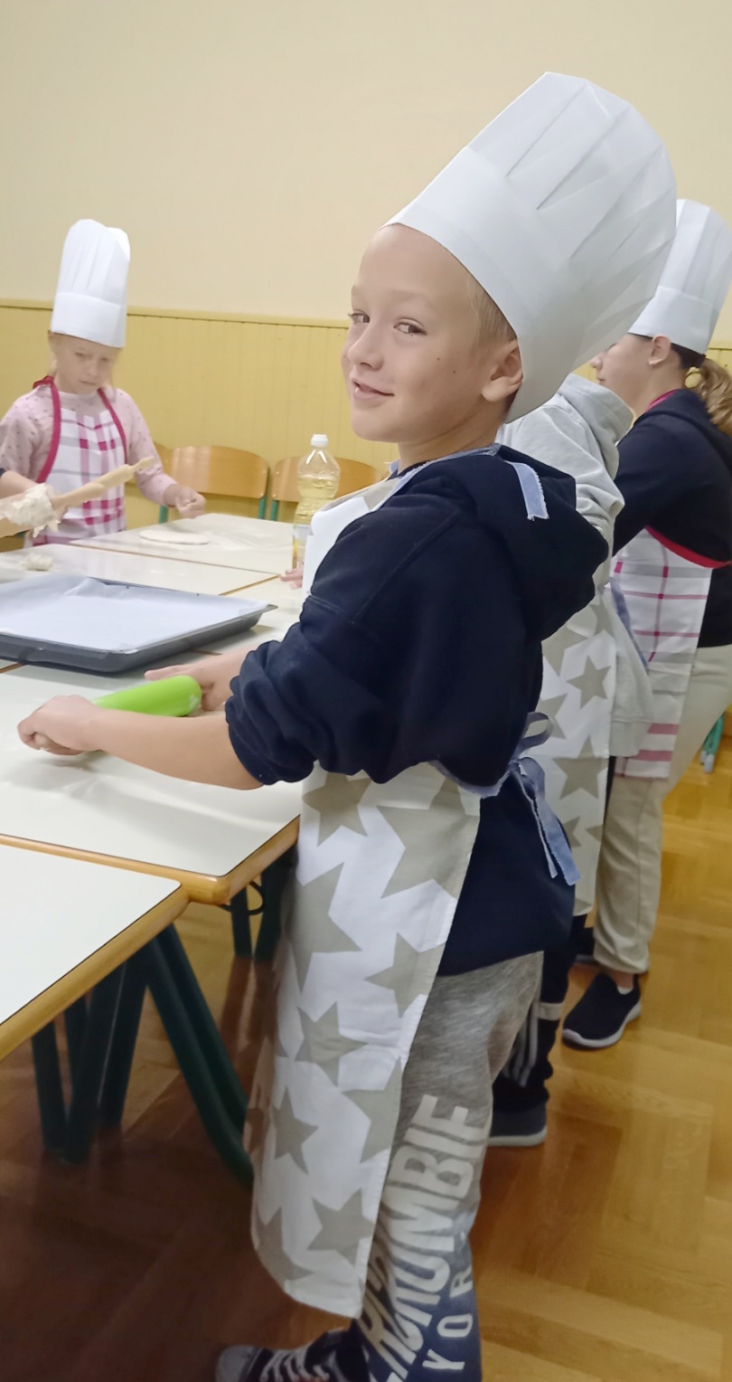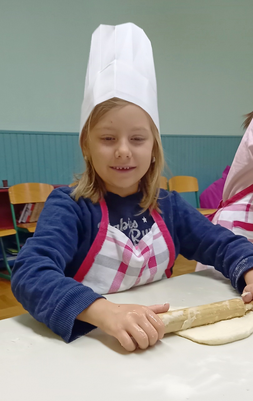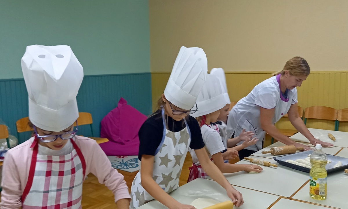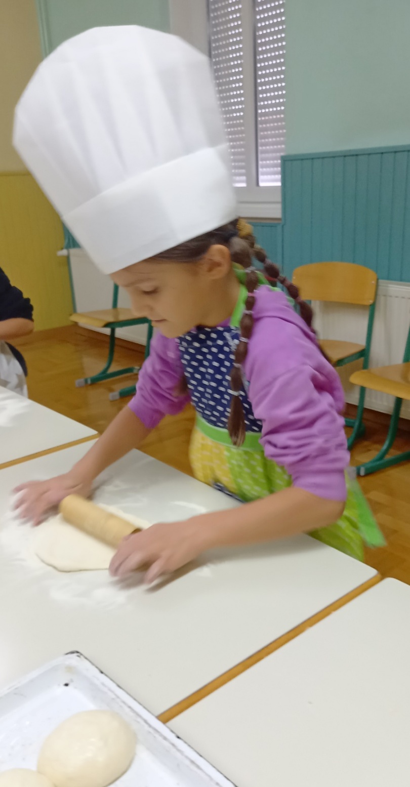 U školi u Donjem Mihaljevcu kuharica je zamijesila tijesto, a učenici svih razreda, 1., 2. i 4., dalje su nastavili ulogu pekara, oduševljeno valjajući tijesto, oblikujući ga i pekavši kruščiće.
