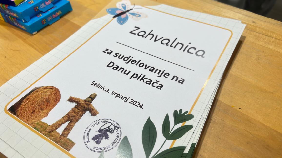 Za kraj radionice, svim je polaznicima podijeljena zahvalnica za sudjelovanje koju im je uručio predsjednik KUD-a Selnica Igor Bodulica. Tom nam je prilikom istaknuo kako će za namatanje pikača biti odabran neki drugi datum, ali i da su se članovi KUD-a potrudili napraviti pikača u maloj verziji kako bi se djeca imala priliku upoznati s tradicijskom maskom ovog kraja