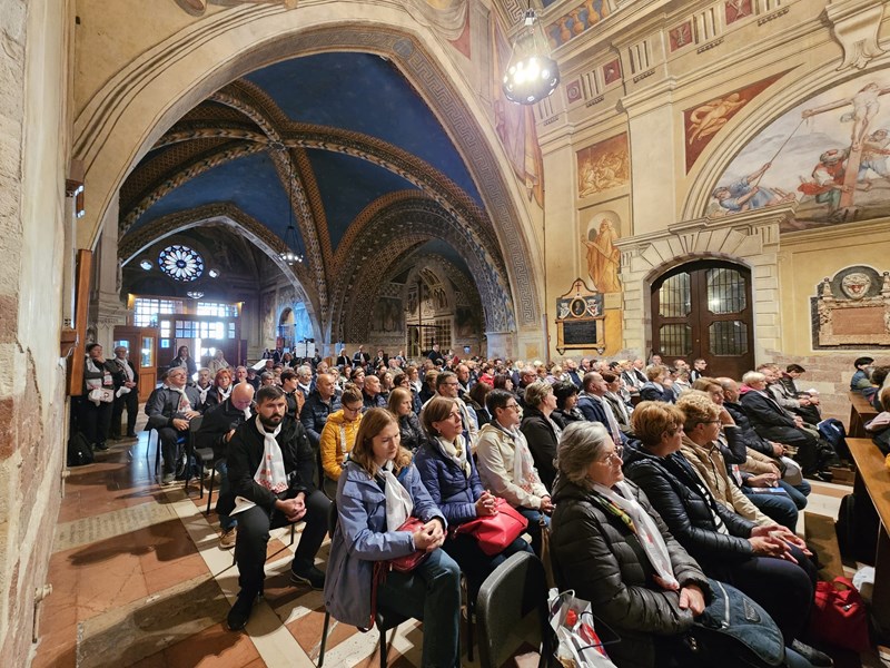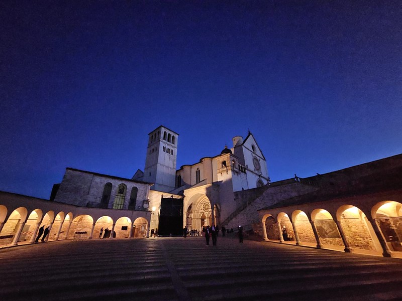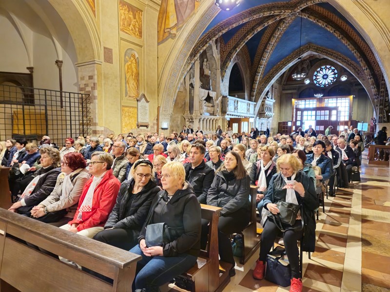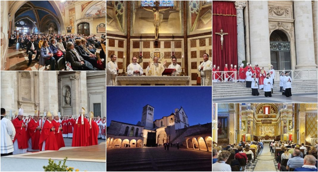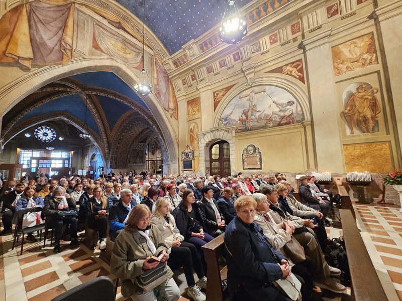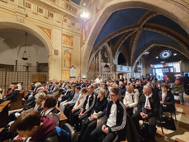 Prva hodočasnička postaja, u ponedjeljak 6. listopada, bio je Asiz, grad sv. Franje i sv. Klare, a odnedavno i svetog Carla Acutisa. Uz razgledavanje bazilika i molitve na grobovima svetaca, hodočasnici su sudjelovali na svetom misnom slavlju koje je predslavio biskup Radoš u bazilici sv. Franje, u Donjoj crkvi, u kapeli sv. Katarine.