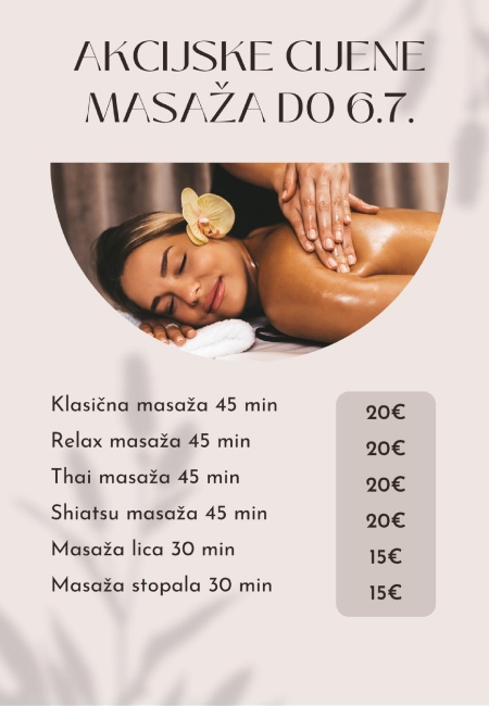 Broj termina je ograničen, a interes već sada nadmašuje očekivanja, stoga se preporučuje pravovremena rezervacija masažnih tretmana uz boravak u resortu. Iskoristite posebne akcijske cijene koje vrijede do 6. srpnja!