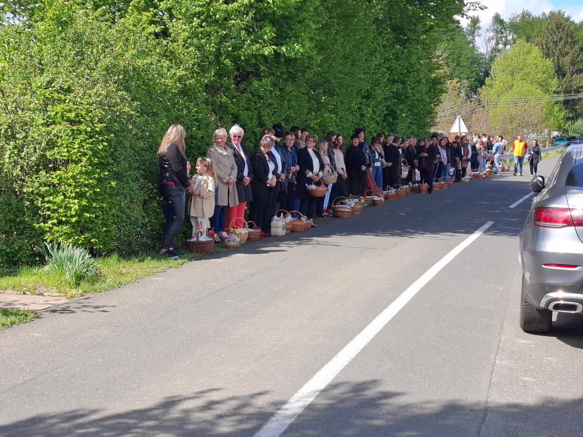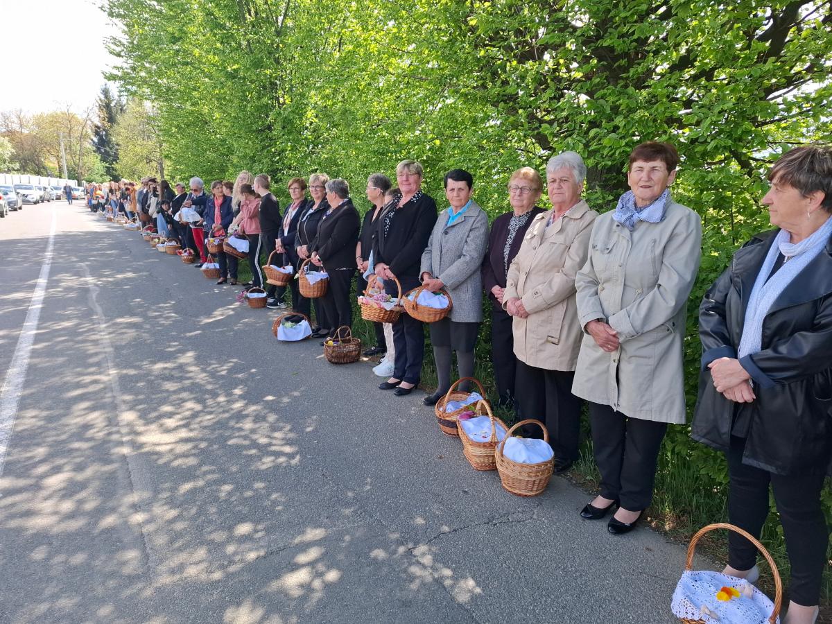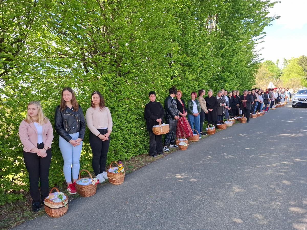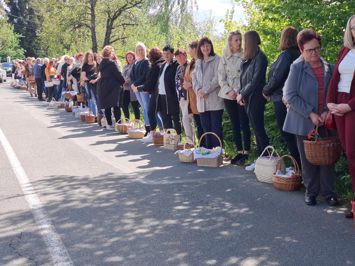 Košarice su bile ispunjene pravim uskrsnim delicijama: šunkom, kobasicama, jajima, mladim lukom, kruhom, kolačima i vinom, koje je blagoslovio župnik župe Svete Katarine djevice i mučenice iz Gornjeg Mihaljevca, velečasni Filip Jakupec.
