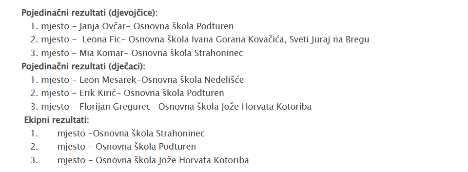 Temeljem rezultata znanja prometnih i sigurnosnih pravila (teoretski dio) koji se provodio u informatičkim učionicama „on-line“ i upravljanja biciklom na vježbalištu u sportskoj dvorani (praktični dio natjecanja), Županijsko povjerenstvo za provedbu natjecanja ”Sigurno u prometu” za osnovne škole međimurske županije za školsku godinu 2024./2025., izradilo je rang listu natjecatelja i škola koja se nalazi u nastavku.