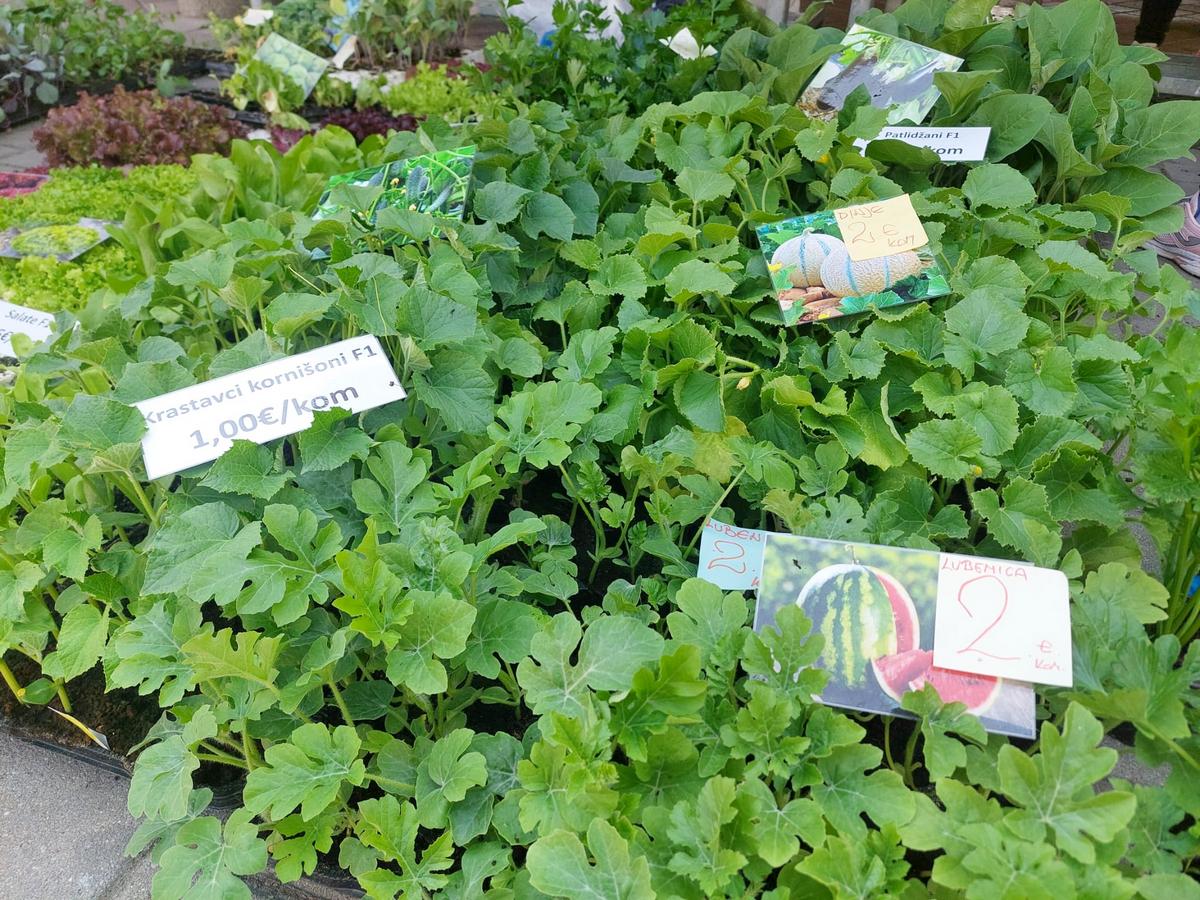 Tržnica u ovo već ljetno vrijeme nudi i velik izbor presadnica. Primjerice, flanci krastavaca, šumskih jagoda, lubenice i dinje su po 2 eura, raznih vrsta rajčica koštaju od 60 centi do 1 eura, flanci patlidžana 50 centi, paprike i celera 30 centi te zelja, kelja i salate po 20 centi. Za obnovu vrta tu ćete se začas opskrbiti!