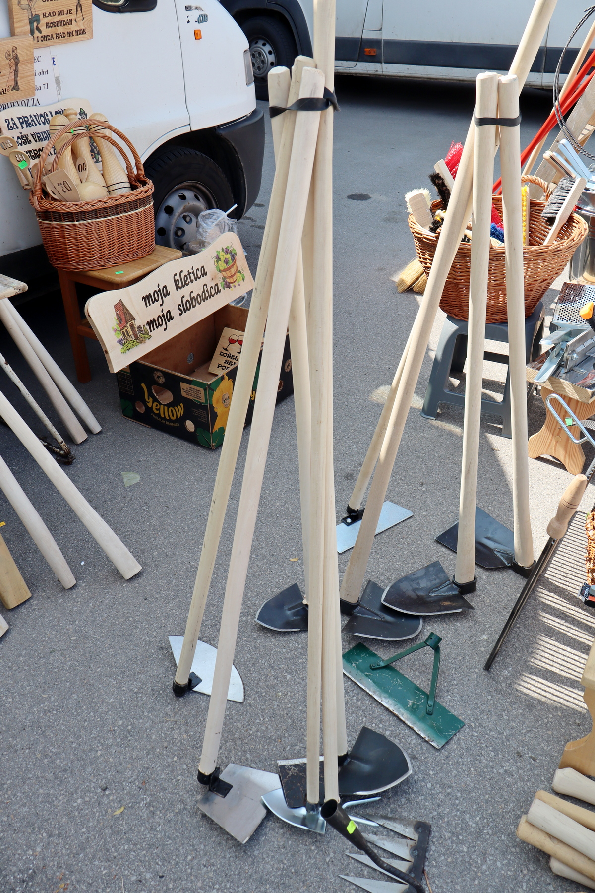 Tu se mogu pronaći, primjerice, praktične košare za 20 ili 30 eura, kvalitetne motike za 12 eura, držač (štil) za 5 eura, muhomlati za dosadne muhe ljeti za 1 euro po komadu te kloferi za 6 eura po komadu, za proljetno klofanje madraca. Za klofere je bio velik interes te su svi rasprodani, no bez brige – novi stižu na tržnicu u subotu!