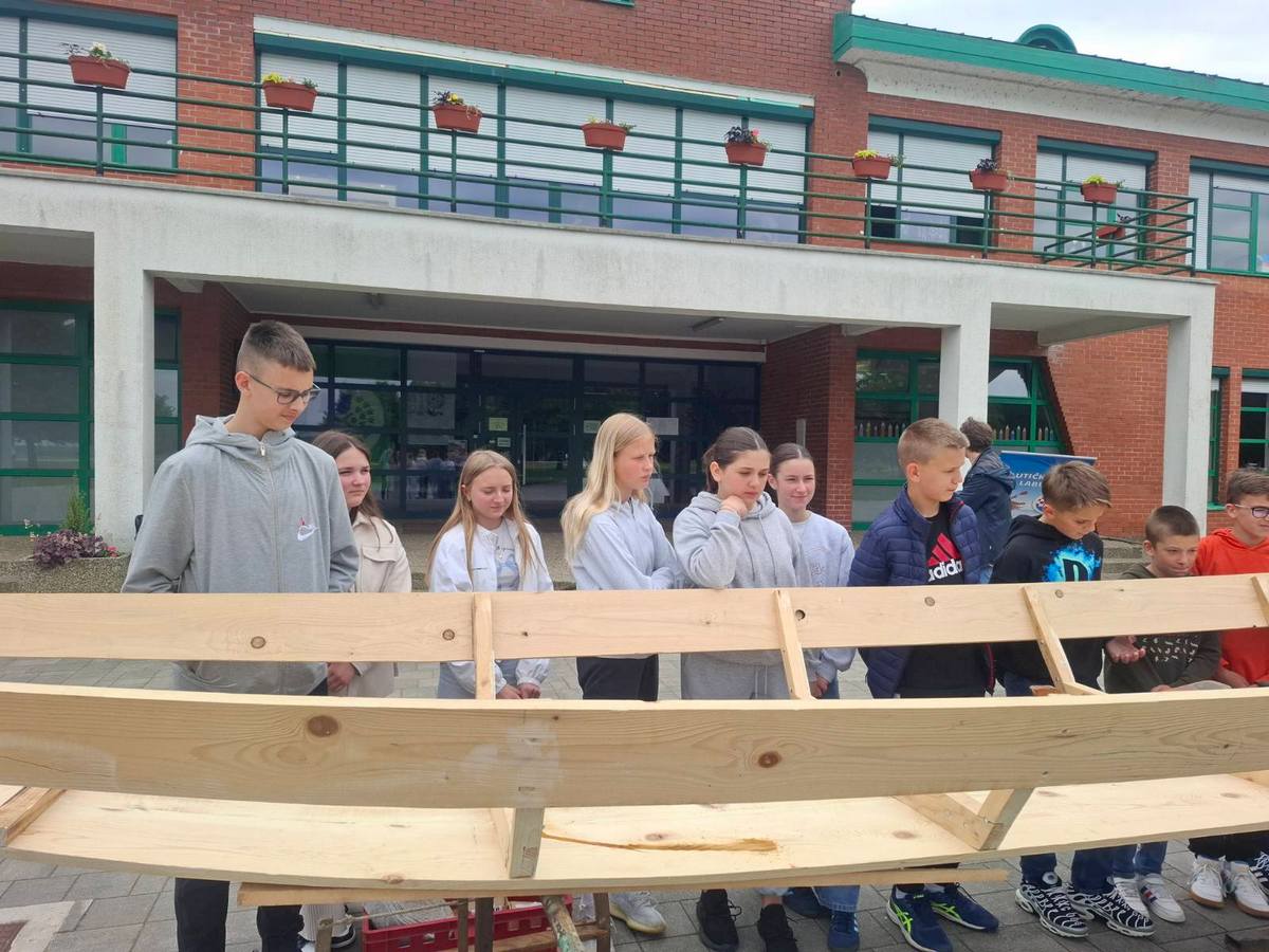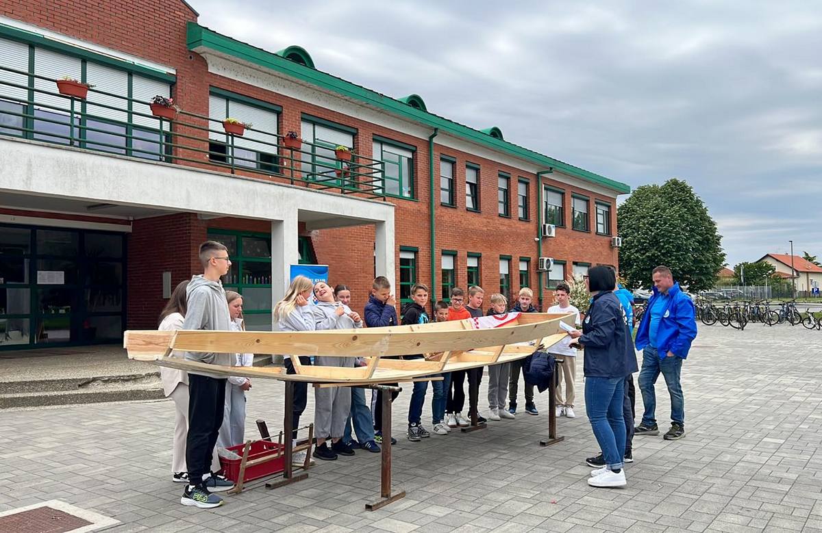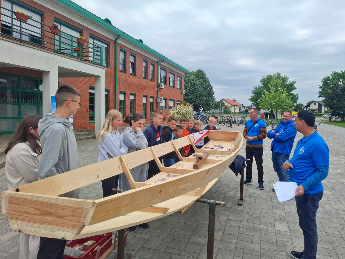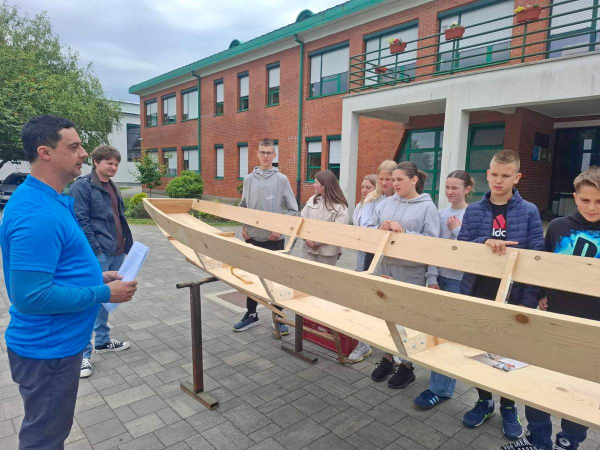 – Ovaj primjer čamca koji je pred vama je 5 metara dužine, 80 cm širine u sredini poda. Prvi kraj čamca je 30 cm, zadnji kraj 60 cm. Potreban alat za izradu je ručna pila, hobić. Spojeve između dasaka zatvaramo filcem, da ne pušta vodu. Zadnji je postupak impregnacija čamca, tj. bojanje zaštitnom, vodootpornom bojom – objasnio je djeci Denis Malek.