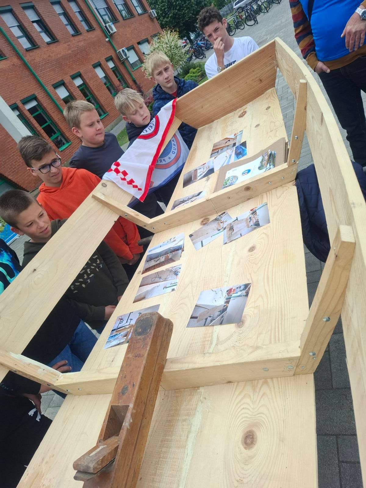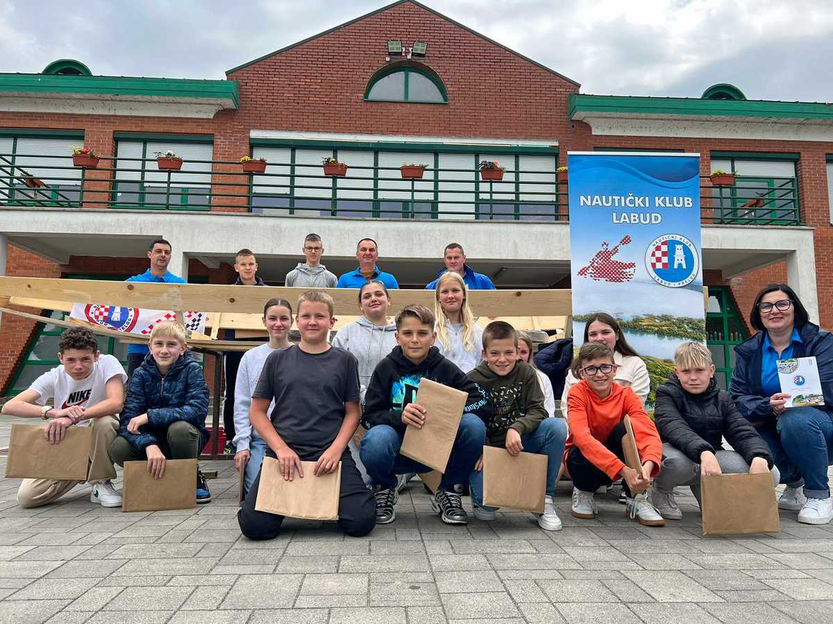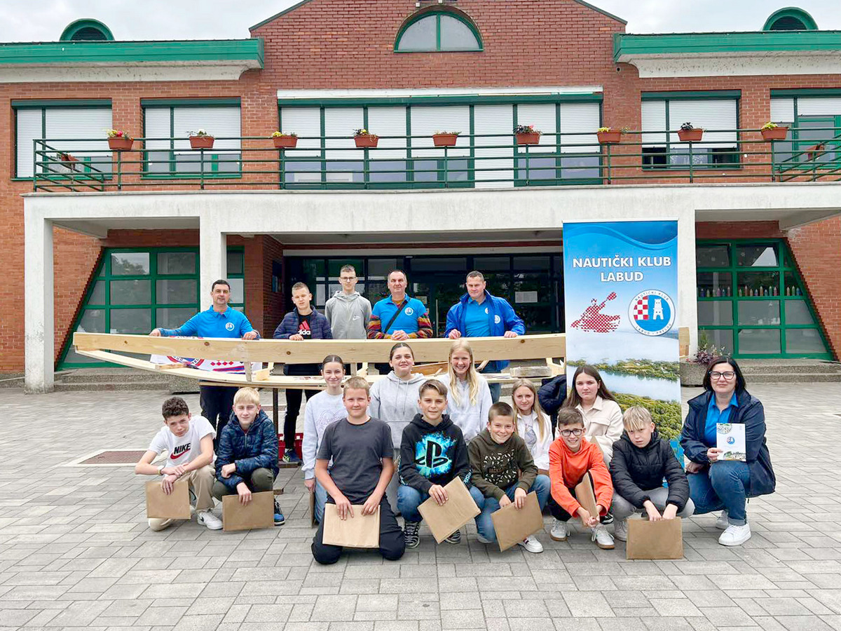 – Ovaj primjer čamca koji je pred vama je 5 metara dužine, 80 cm širine u sredini poda. Prvi kraj čamca je 30 cm, zadnji kraj 60 cm. Potreban alat za izradu je ručna pila, hobić. Spojeve između dasaka zatvaramo filcem, da ne pušta vodu. Zadnji je postupak impregnacija čamca, tj. bojanje zaštitnom, vodootpornom bojom – objasnio je djeci Denis Malek.
