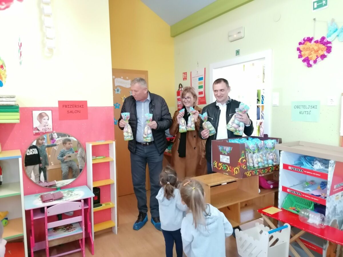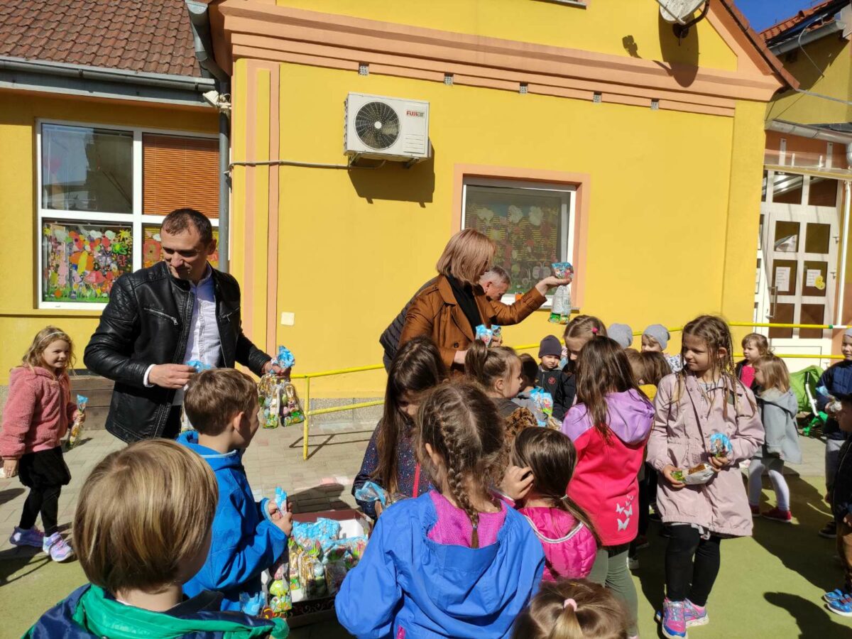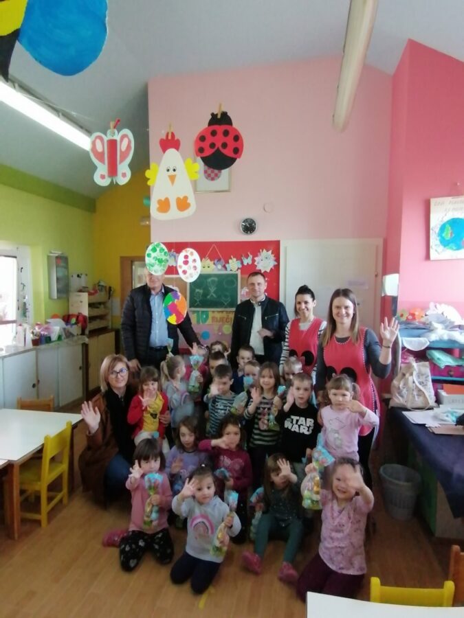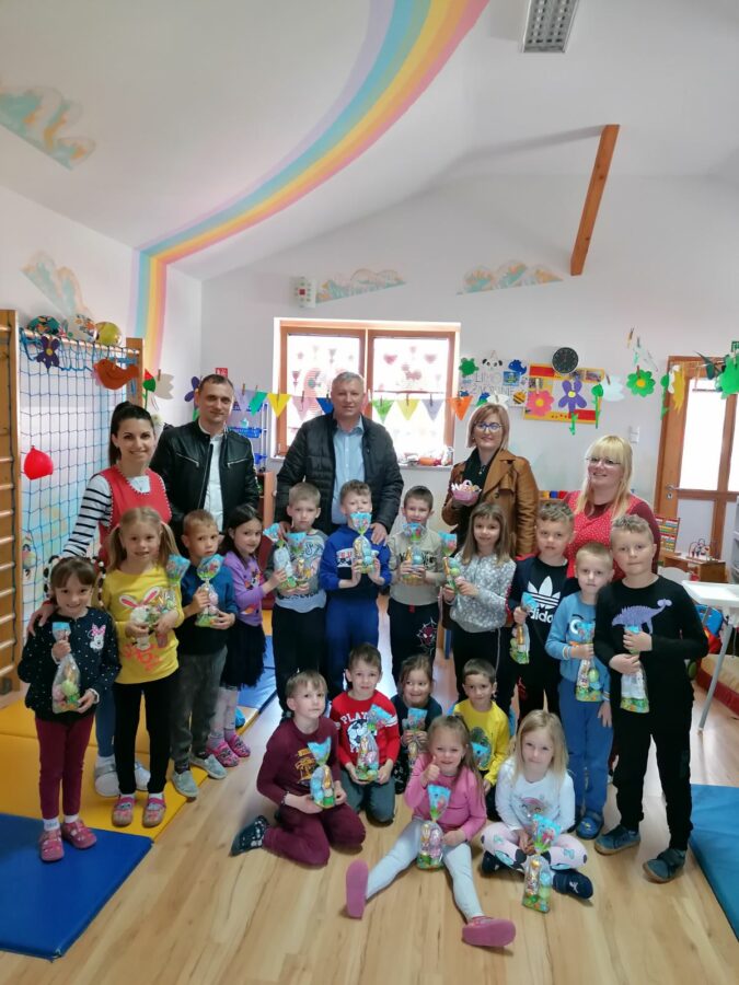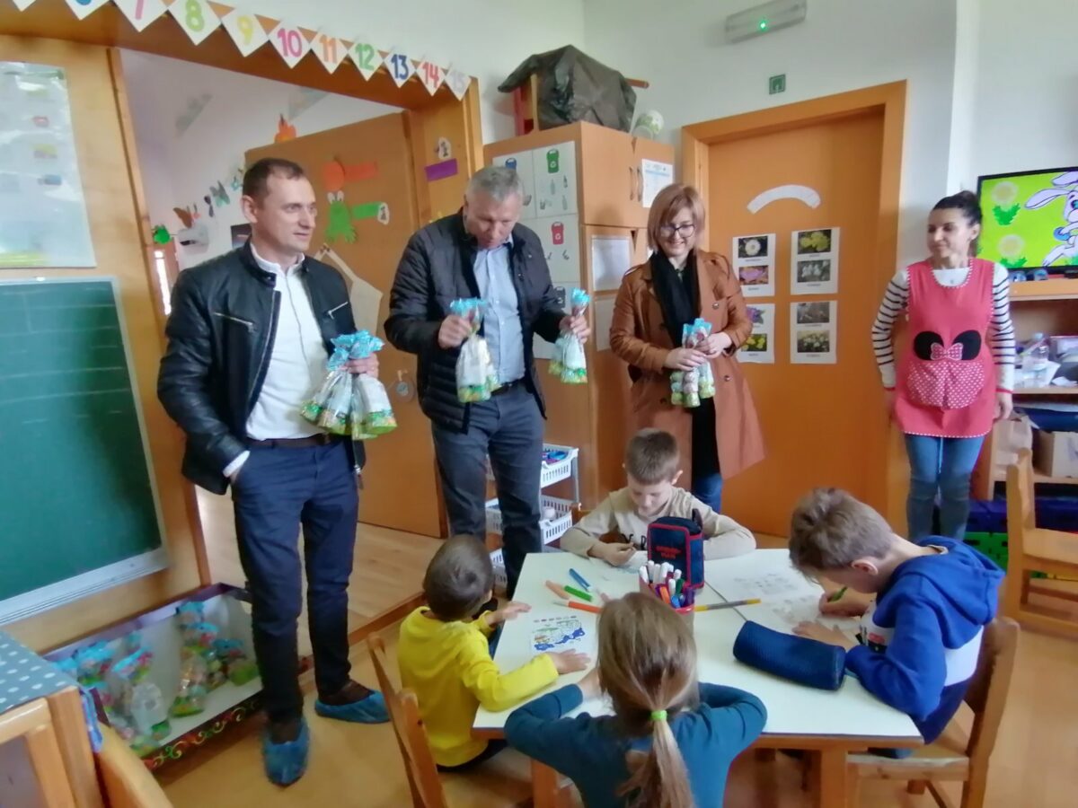 Načelnik Općine Martin Srša djeci i svim djelatnicima Osnovne škole i vrtića čestitao je sretan Uskrs, a u podjeli poklon paketića djeci pomogli su mu predsjednik Općinskog vijeća Ivica Kutnjak te pročelnica Vlatka Županec.