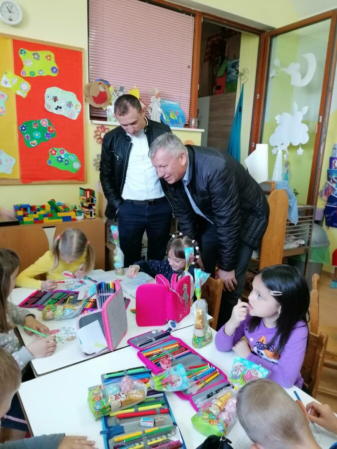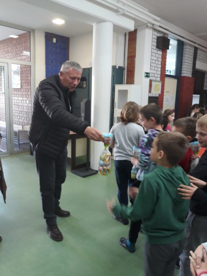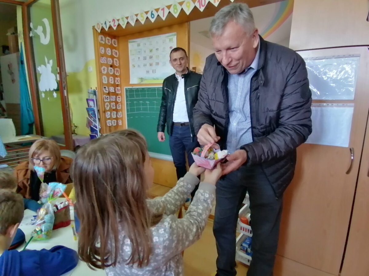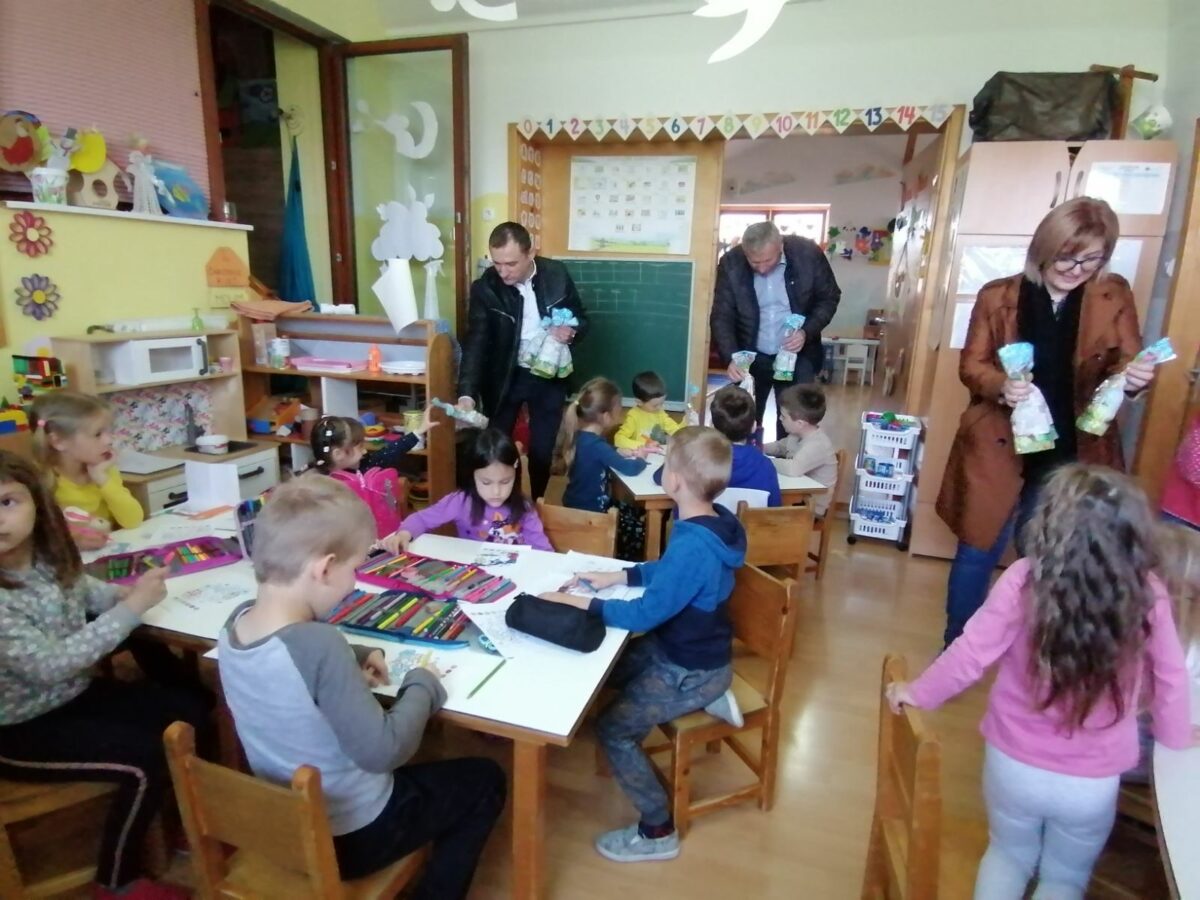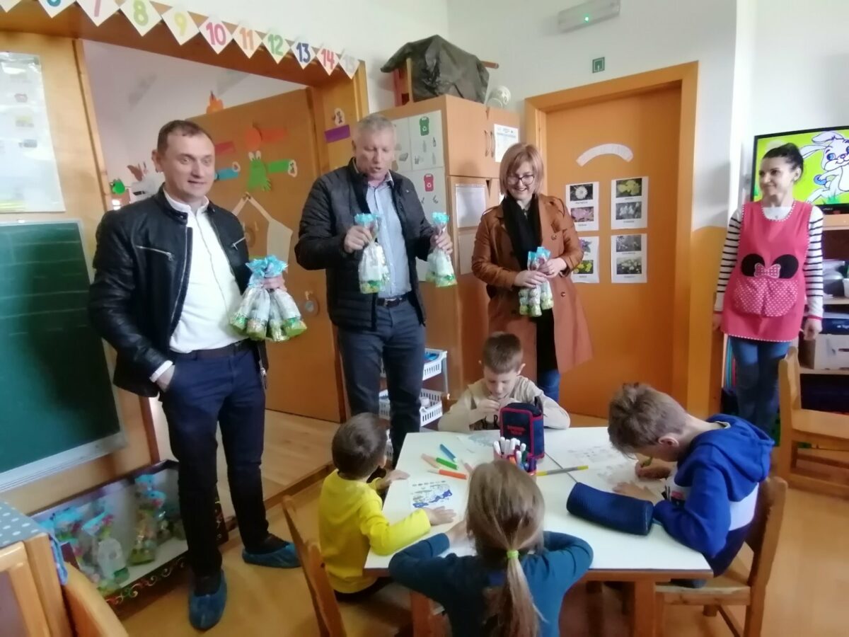 Načelnik Općine Martin Srša djeci i svim djelatnicima Osnovne škole i vrtića čestitao je sretan Uskrs, a u podjeli poklon paketića djeci pomogli su mu predsjednik Općinskog vijeća Ivica Kutnjak te pročelnica Vlatka Županec.