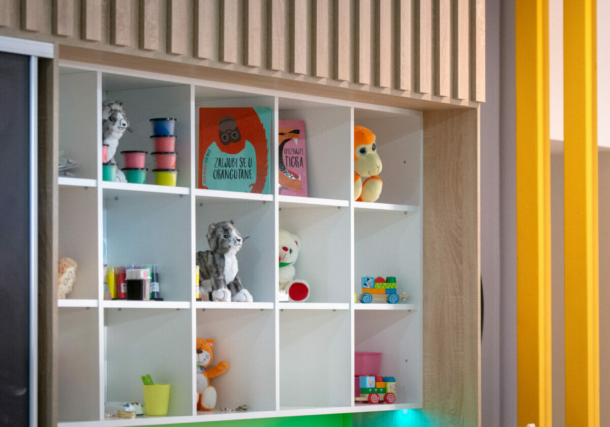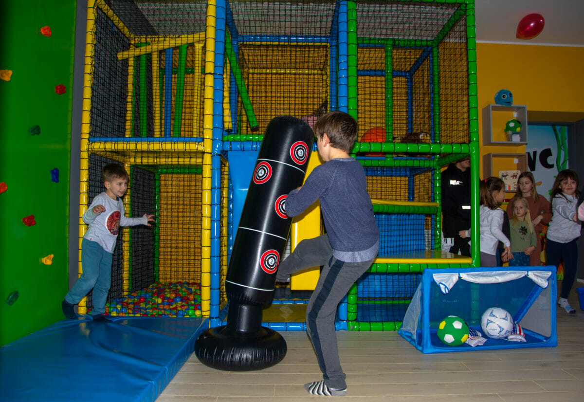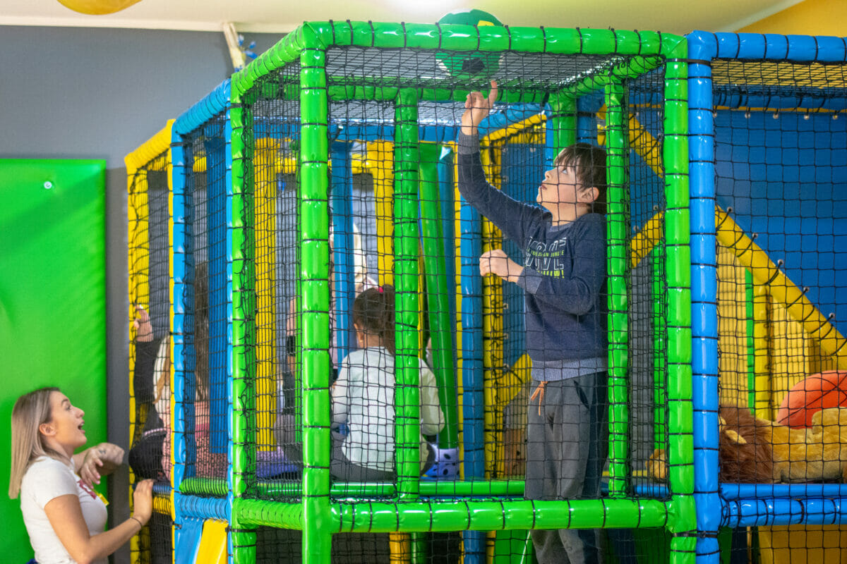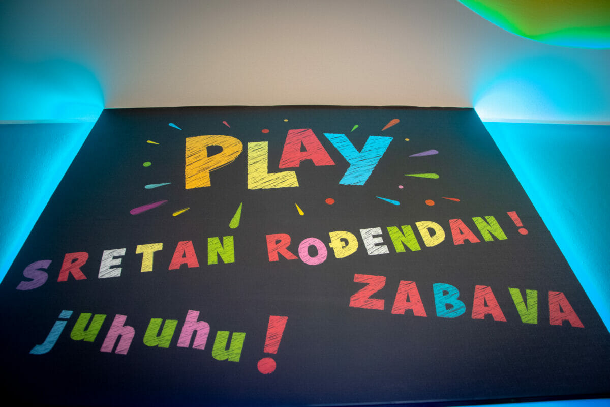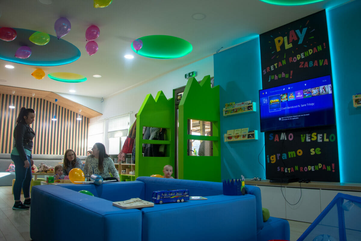 Ovaj vedri prostor od oko 100 kvadrata, sadrži i penjalicu-stijenu, kavez za igru s penjalicama, playstation, razne društvene igre, kocke, plišance, slikovnice i još mnogo toga. Prostor je uredila dizajnerica interijera Maja Huzjan iz Murskog Središća.