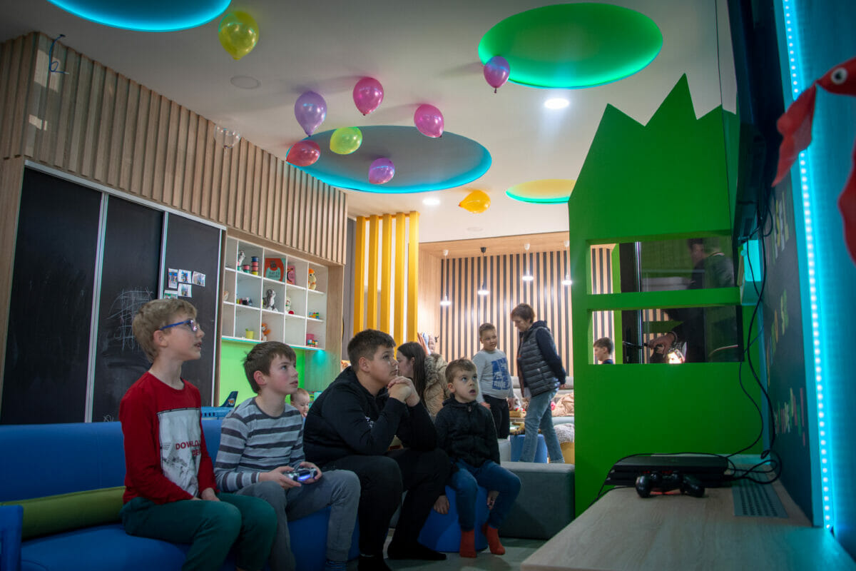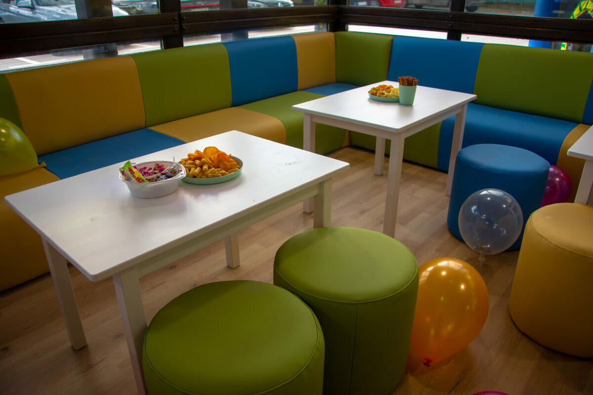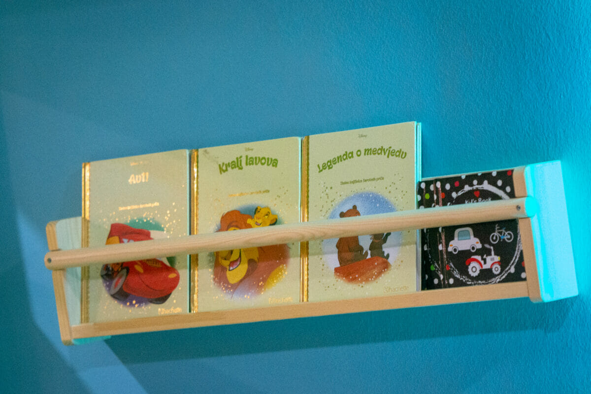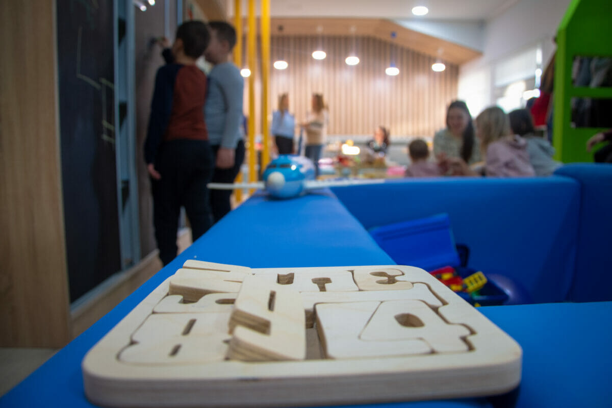 Ovaj vedri prostor od oko 100 kvadrata, sadrži i penjalicu-stijenu, kavez za igru s penjalicama, playstation, razne društvene igre, kocke, plišance, slikovnice i još mnogo toga. Prostor je uredila dizajnerica interijera Maja Huzjan iz Murskog Središća.