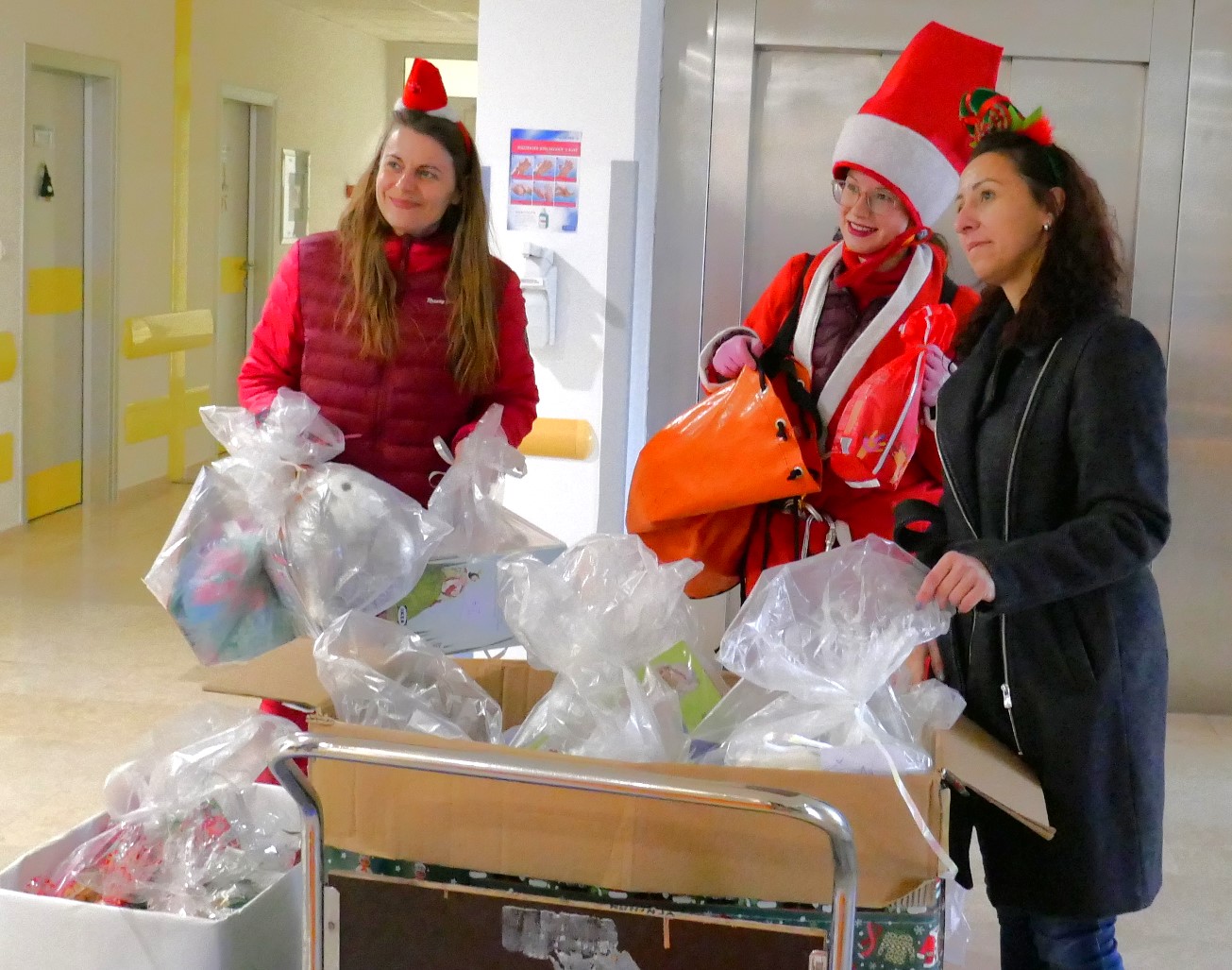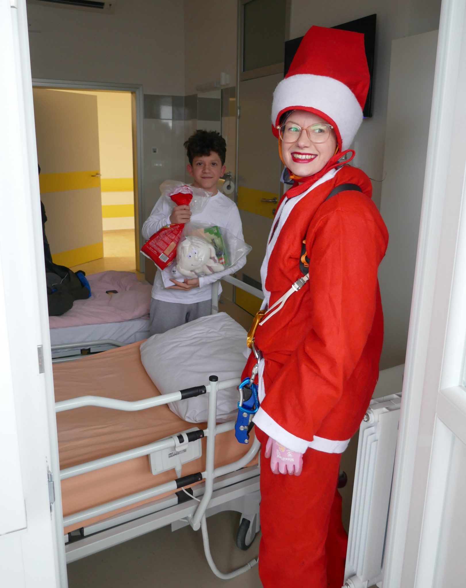 Mališani, koji se nalaze zbrinuti na Odjelu pedijatrije Županijske bolnice Čakovec, danas prije podne doživjeli su zaista ugodno iznenađenje. Djedovi Božićnjaci spustili su se užetima s krova bolnice i kroz balkon im ušli u bolesničke sobe i donijeli poklon pakete sa slasticama i igračkama.