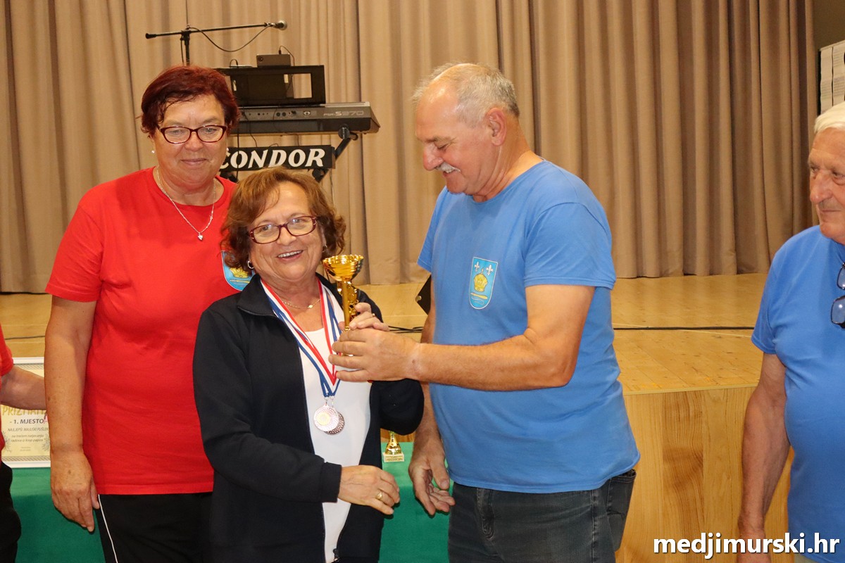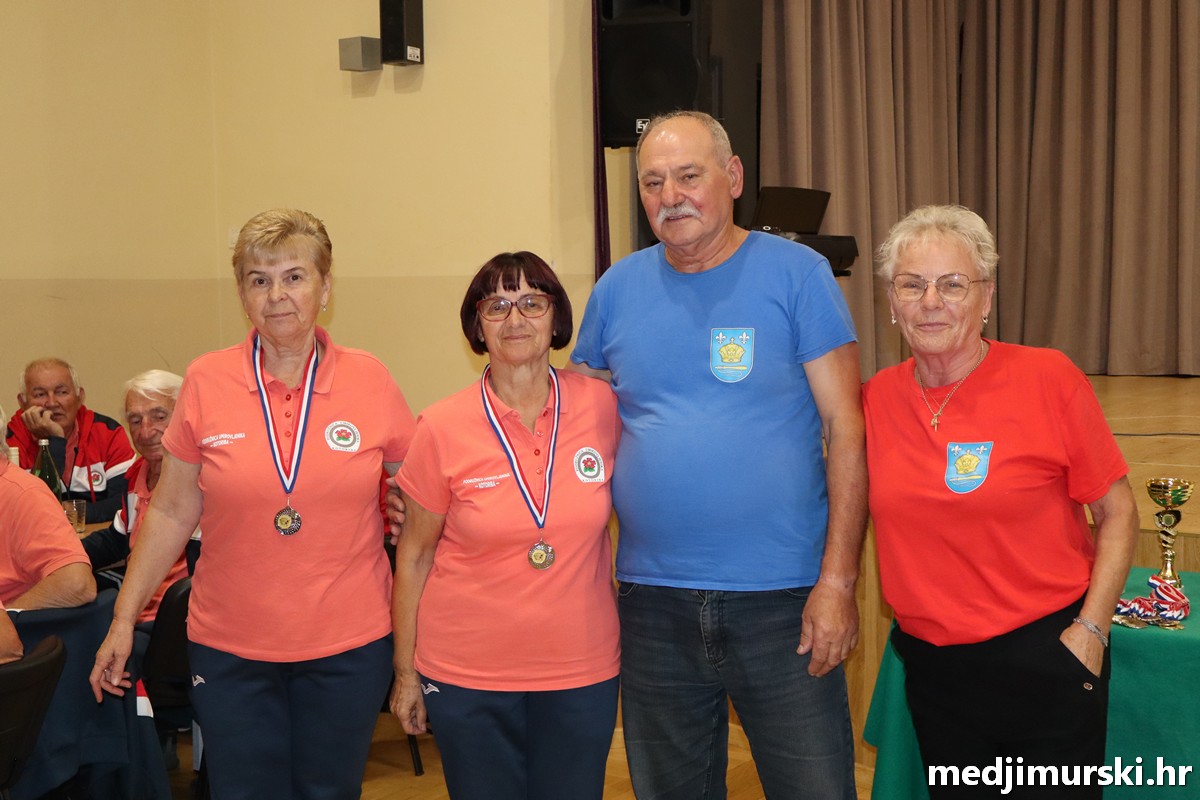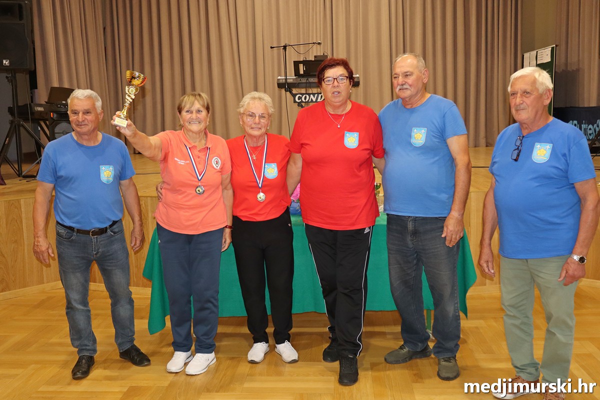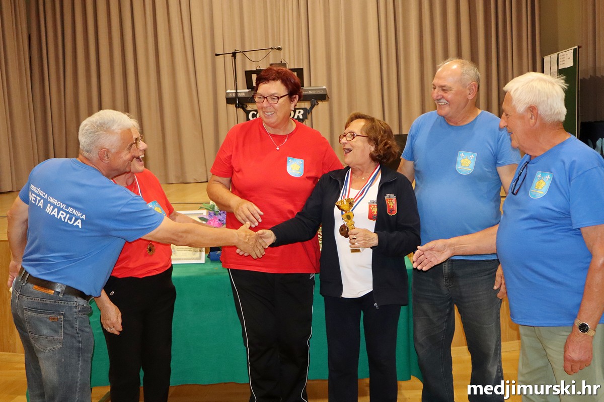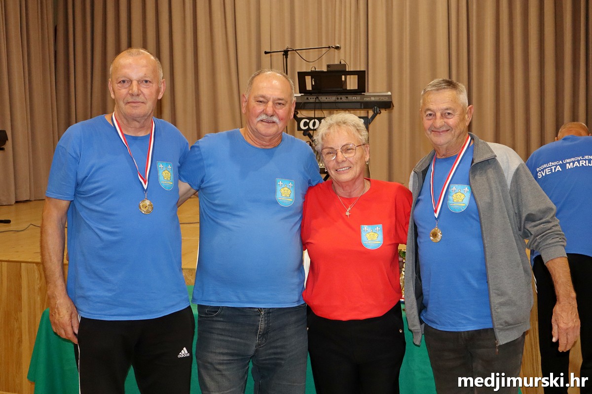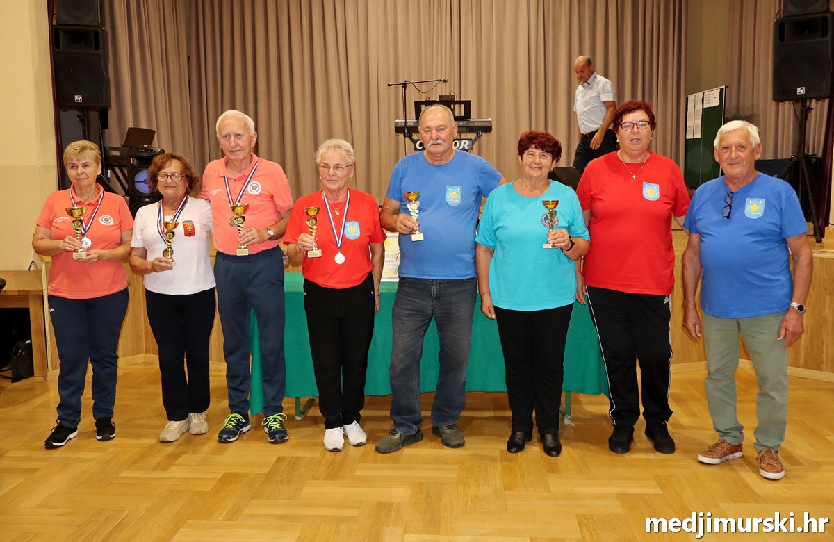 a na kraju su nagrade najboljim ekipama uz čestitke uručili predsjednik Podružnice umirovljenika Sveta Marija Antun Peter i tajnica Biserka Strbad. Svi su pobjednici dobili puse i medalje, a najbolje ekipe u ukupnom muškom i ženskom poretku i pehare.