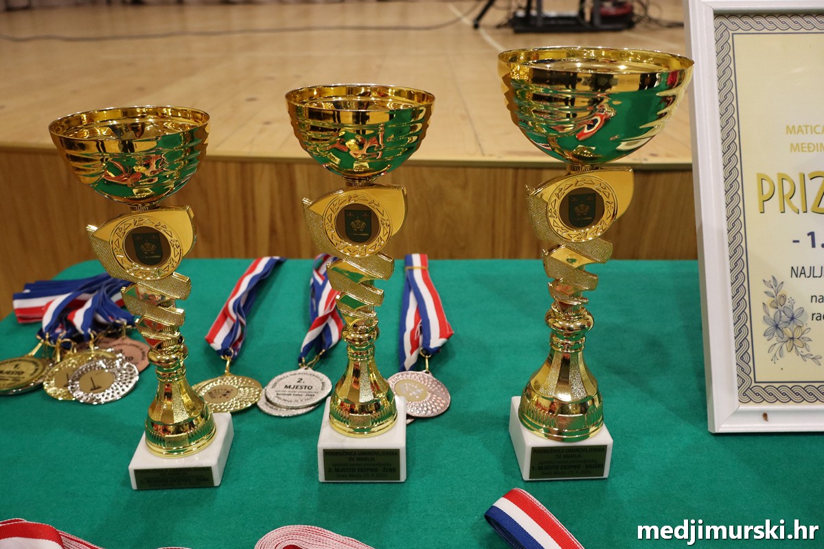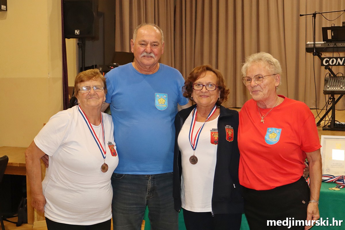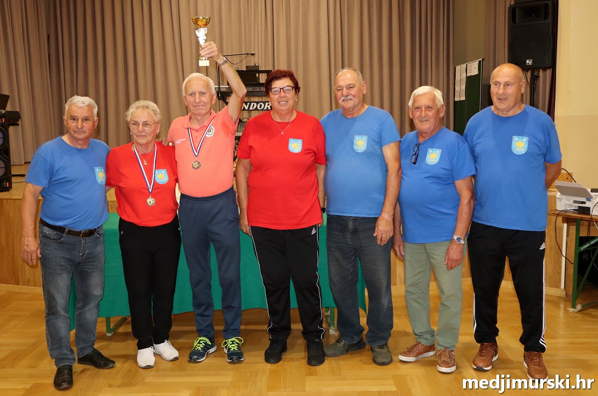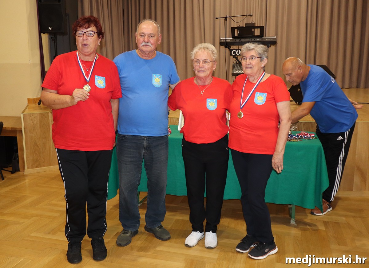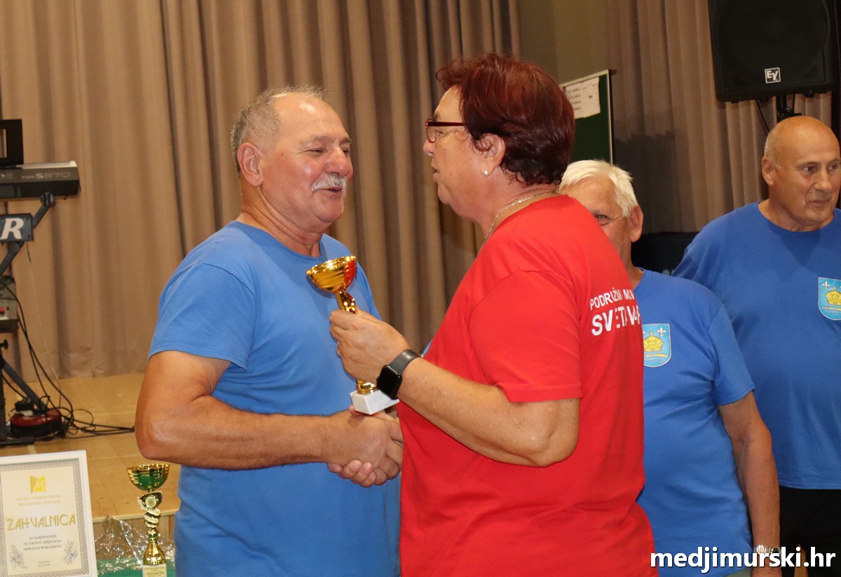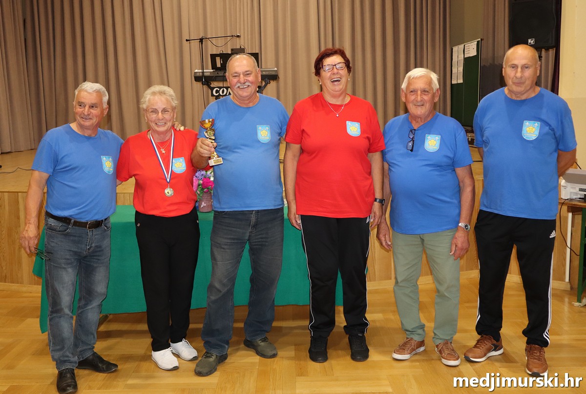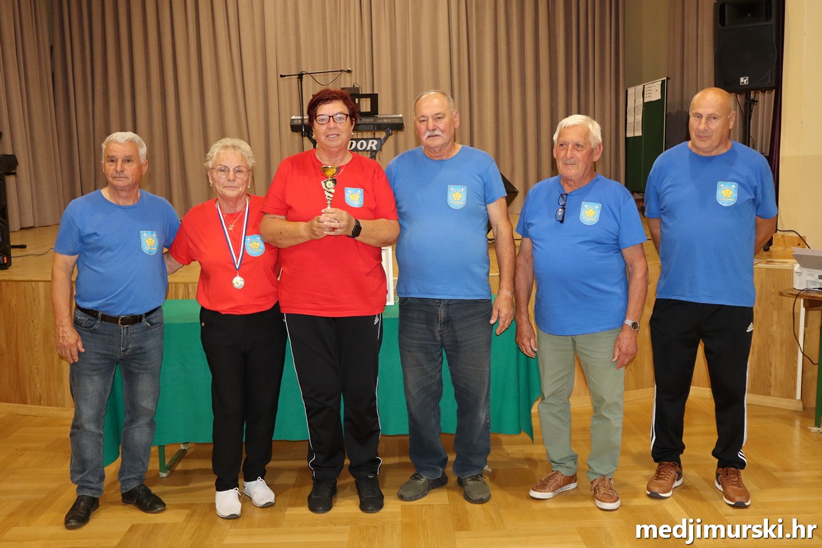 a na kraju su nagrade najboljim ekipama uz čestitke uručili predsjednik Podružnice umirovljenika Sveta Marija Antun Peter i tajnica Biserka Strbad. Svi su pobjednici dobili puse i medalje, a najbolje ekipe u ukupnom muškom i ženskom poretku i pehare.