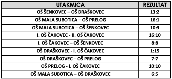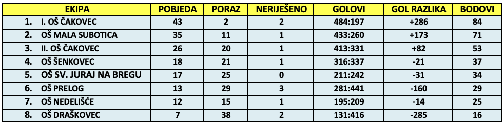 Odigravanjem 7. kola završeno je natjecanje za ovu sezonu, a naslov pobjednika osvojili su učenici i učenice prve osnovne škole Čakovec, koje vodi profesor Matija Horvat, drugo mjesto osvojila je OŠ Tomaša Goričanca Mala Subotica koje vodi profesorica Dora Puklek, a treće mjesto druga osnovna škola Čakovec koje vodi profesor Dario Varga.
