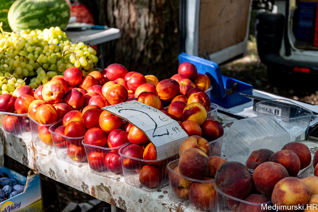 Očišćeni orasi nuđeni su po 12 eura kilogram. Vinogradarske breske bile su po 3 eura kg. Marelice su nuđene po 3 eura, šljive po 2,5 eura, jabuke stare po 1 euro kg, a ovogodišnje do 1,50 eura kilogram, limun po 3, grožđe po 4, kruške vugice po 3, a datulje, suhe šljive i suhe smokve po 5 eura kilogram. Breskve su bile po 3 eura kg, a lubenice od 3 do 5 eura komad.