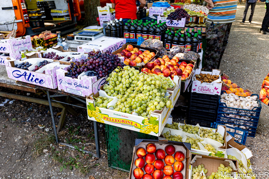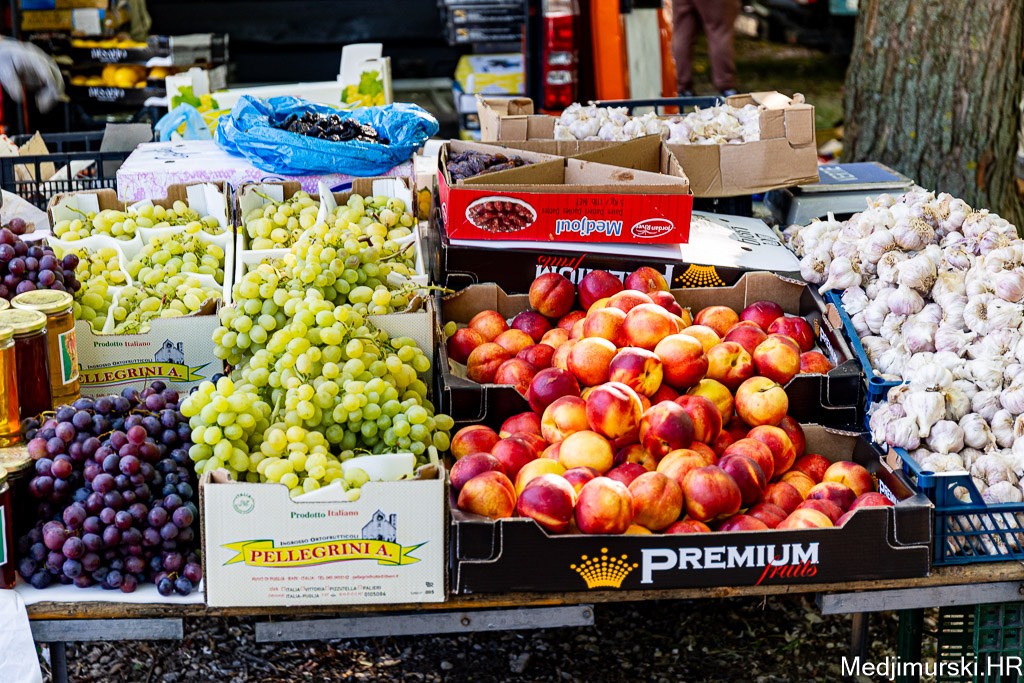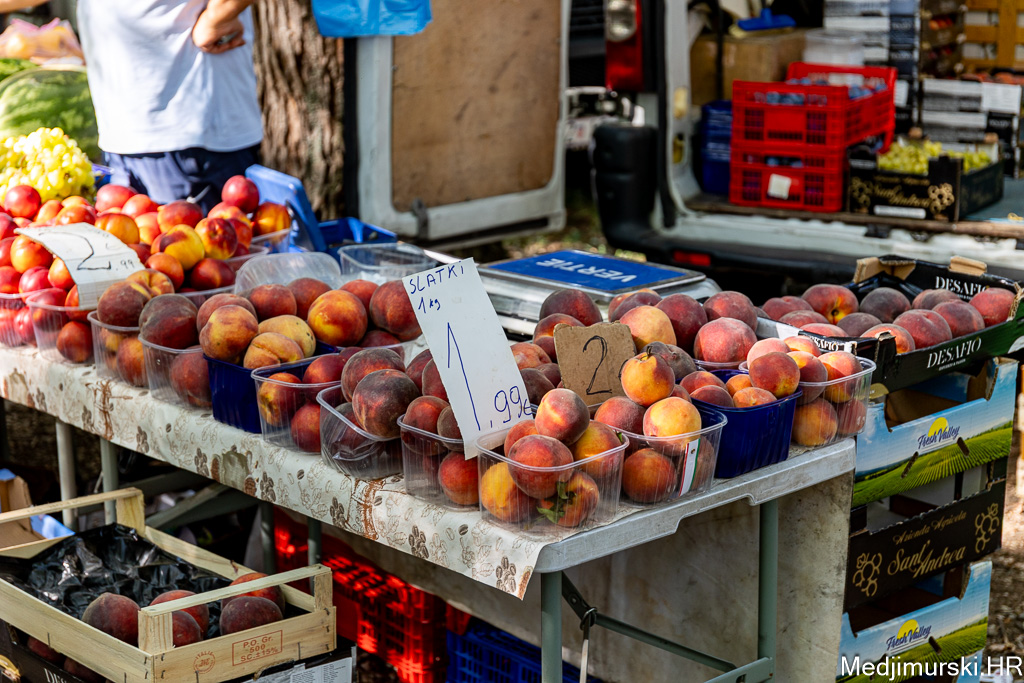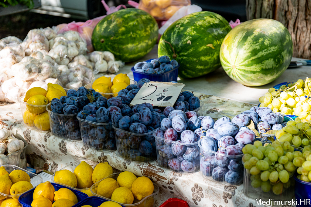 Očišćeni orasi nuđeni su po 12 eura kilogram. Vinogradarske breske bile su po 3 eura kg. Marelice su nuđene po 3 eura, šljive po 2,5 eura, jabuke stare po 1 euro kg, a ovogodišnje do 1,50 eura kilogram, limun po 3, grožđe po 4, kruške vugice po 3, a datulje, suhe šljive i suhe smokve po 5 eura kilogram. Breskve su bile po 3 eura kg, a lubenice od 3 do 5 eura komad.