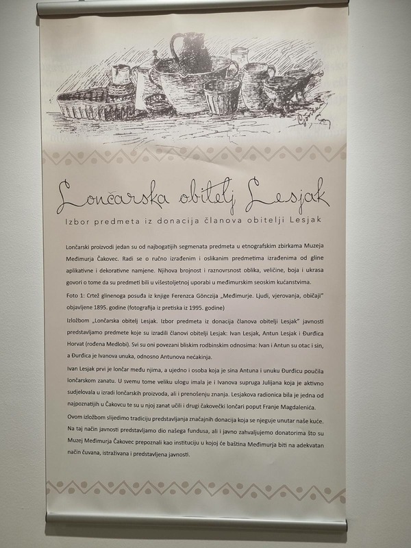 U obnovljenom Izložbenom salonu Muzeja Međimurja Čakovec sinoć je otvorena izložba „Lončarska obitelj Lesjak – izbor predmeta iz donacija članovi obitelji Lesjak“. Sveukupno je izloženo 156 predmeta iz fundusa Muzeja Međimurja koje su izradili članovi spomenute obitelji: Ivan Lesjak te njegov sin Antun i unuka Đurđica Horvat koja je i pozdravila veliki broj gostiju na otvorenju.