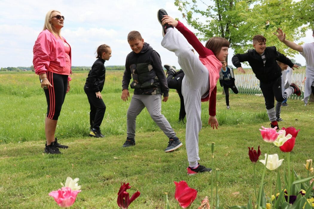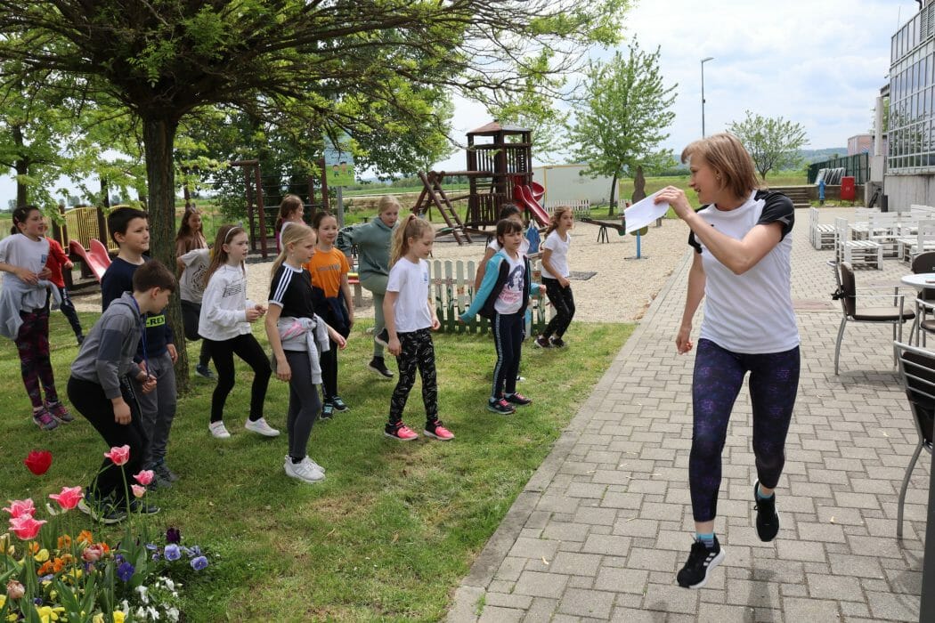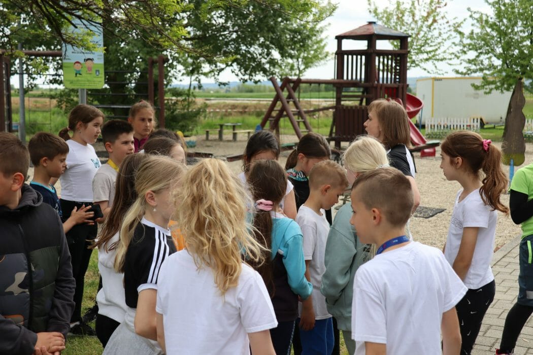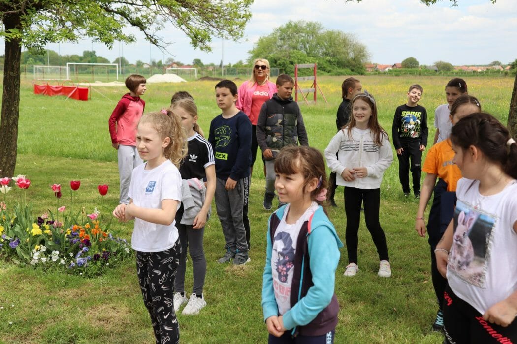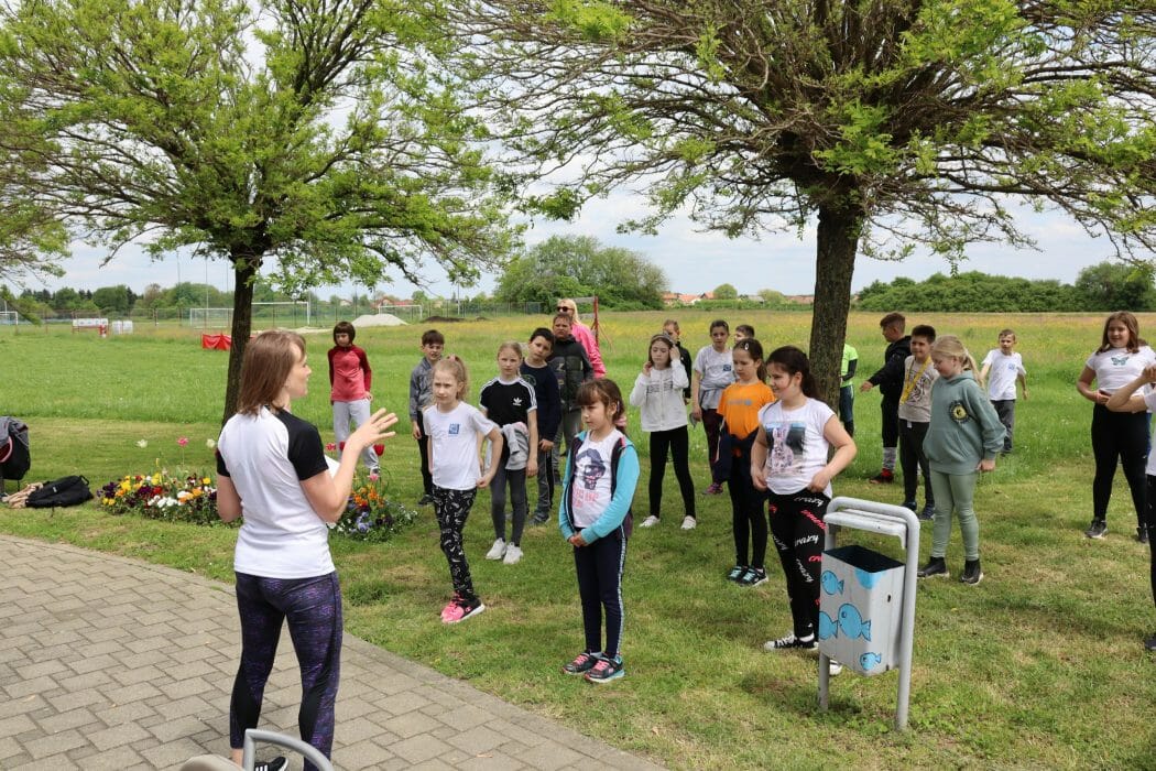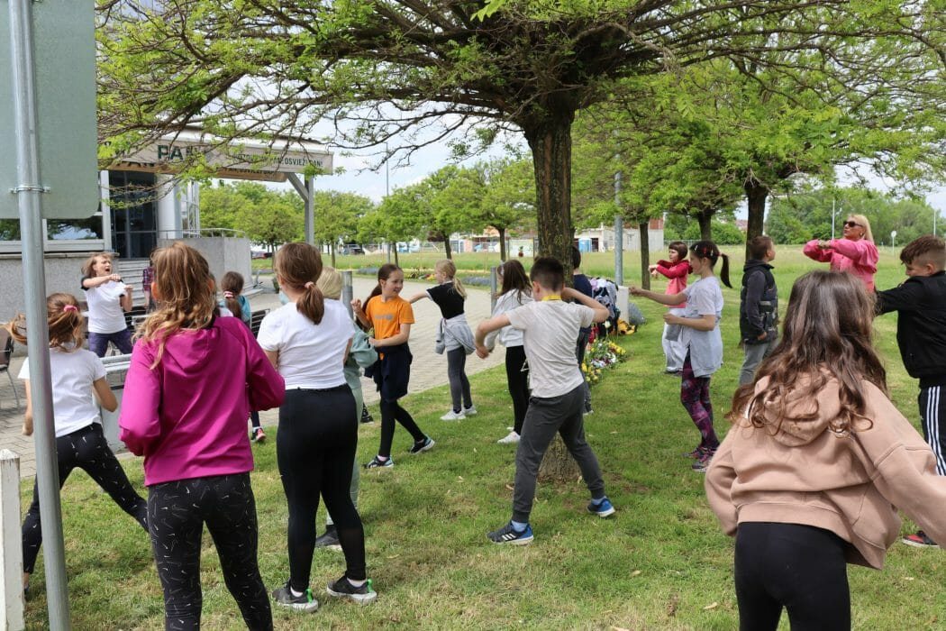 Šetnjom uz potok Koprivnica učenici su stigli do Gradskih bazena Cerine gdje ih je dočekala trenerica Sportskog centra Cerine, Duška Salaj s kojom su razgibali svoje tijelo te napravili niz raznolikih funkcionalnih vježbi za stabilnost, mobilnost i fleksibilnost.
