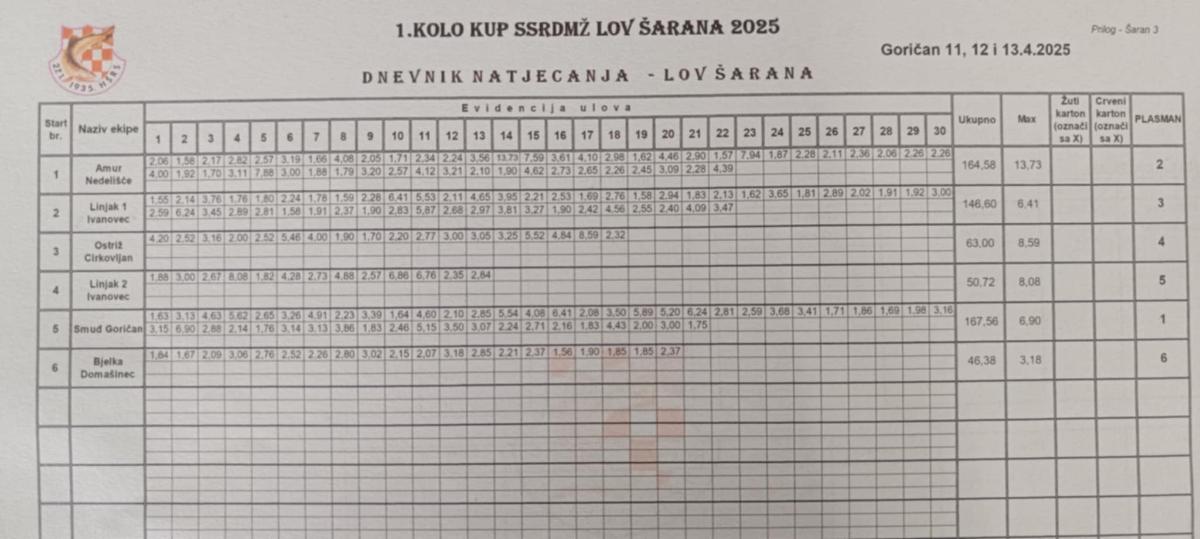 Dnevnik natjecanja 1. kola Međimurske šaranske lige: https://ssrd.hr/index.php/2025/04/15/rezultati-saranska-liga/