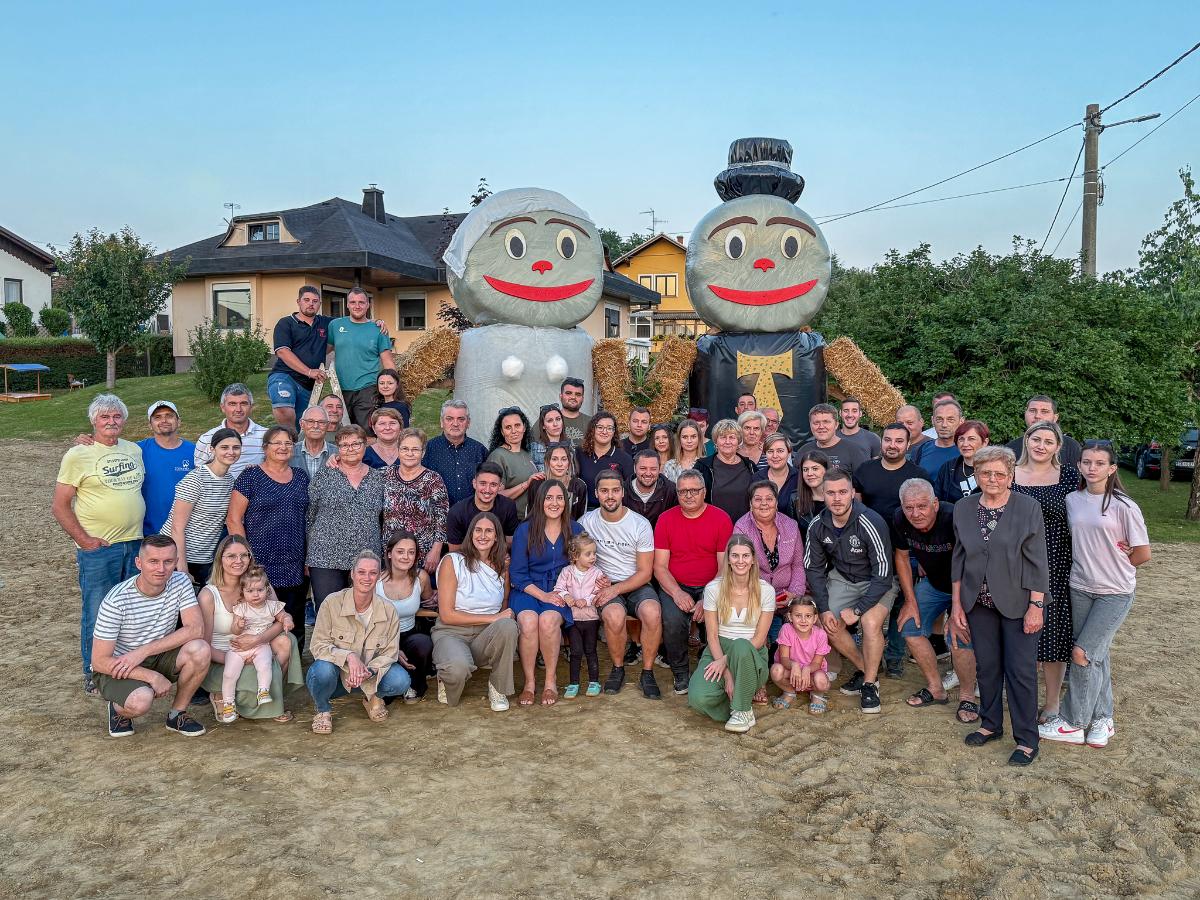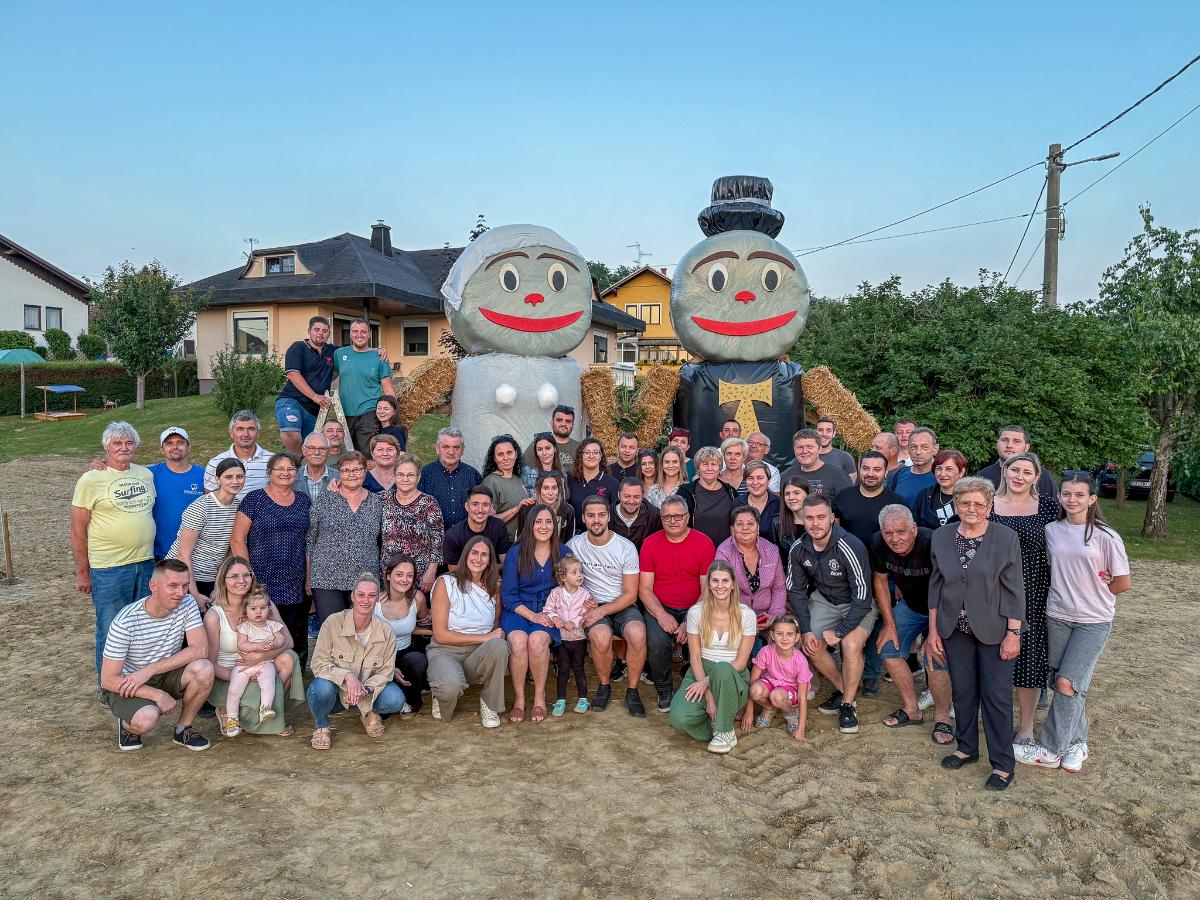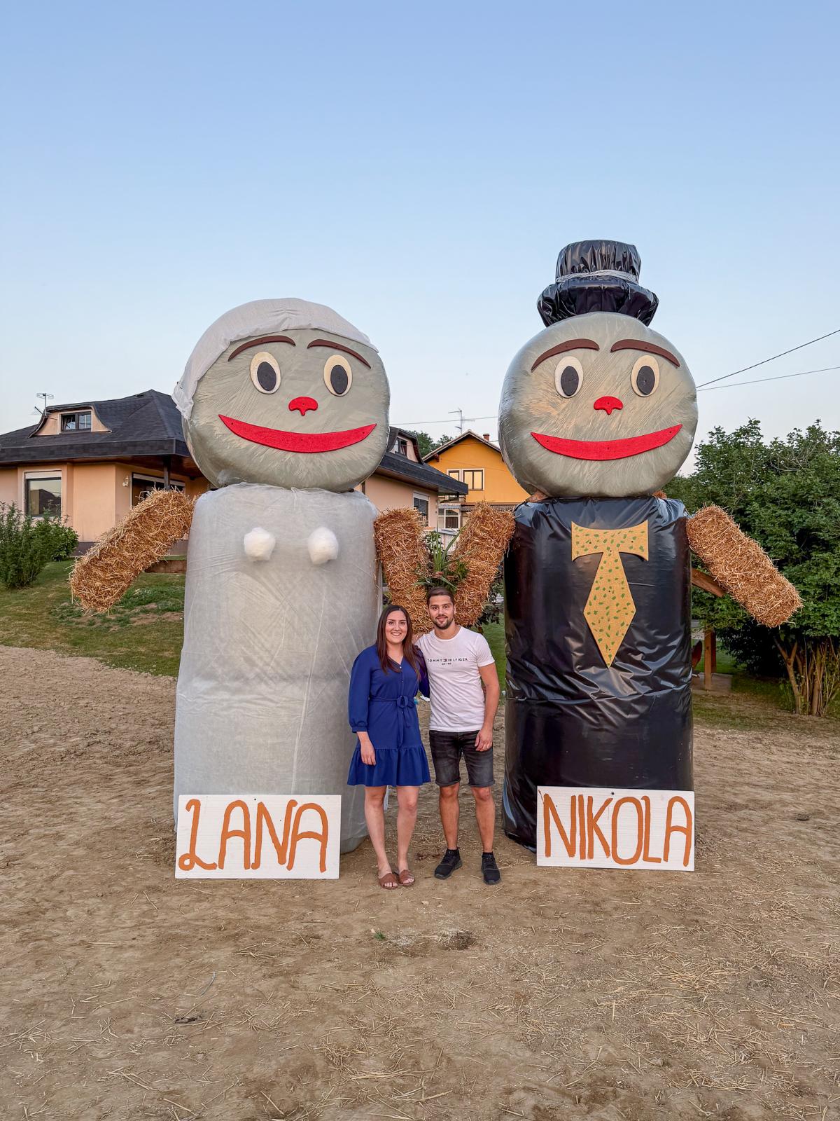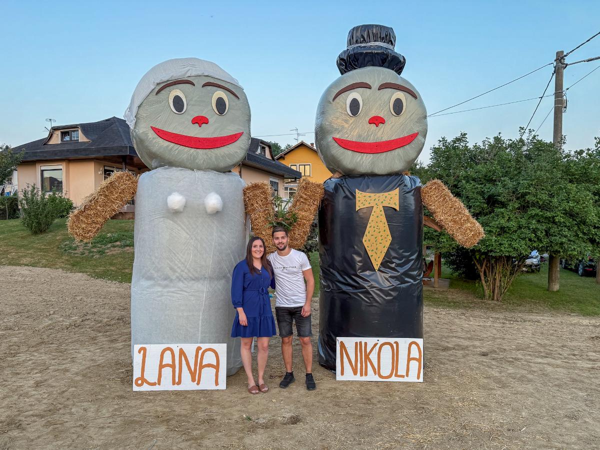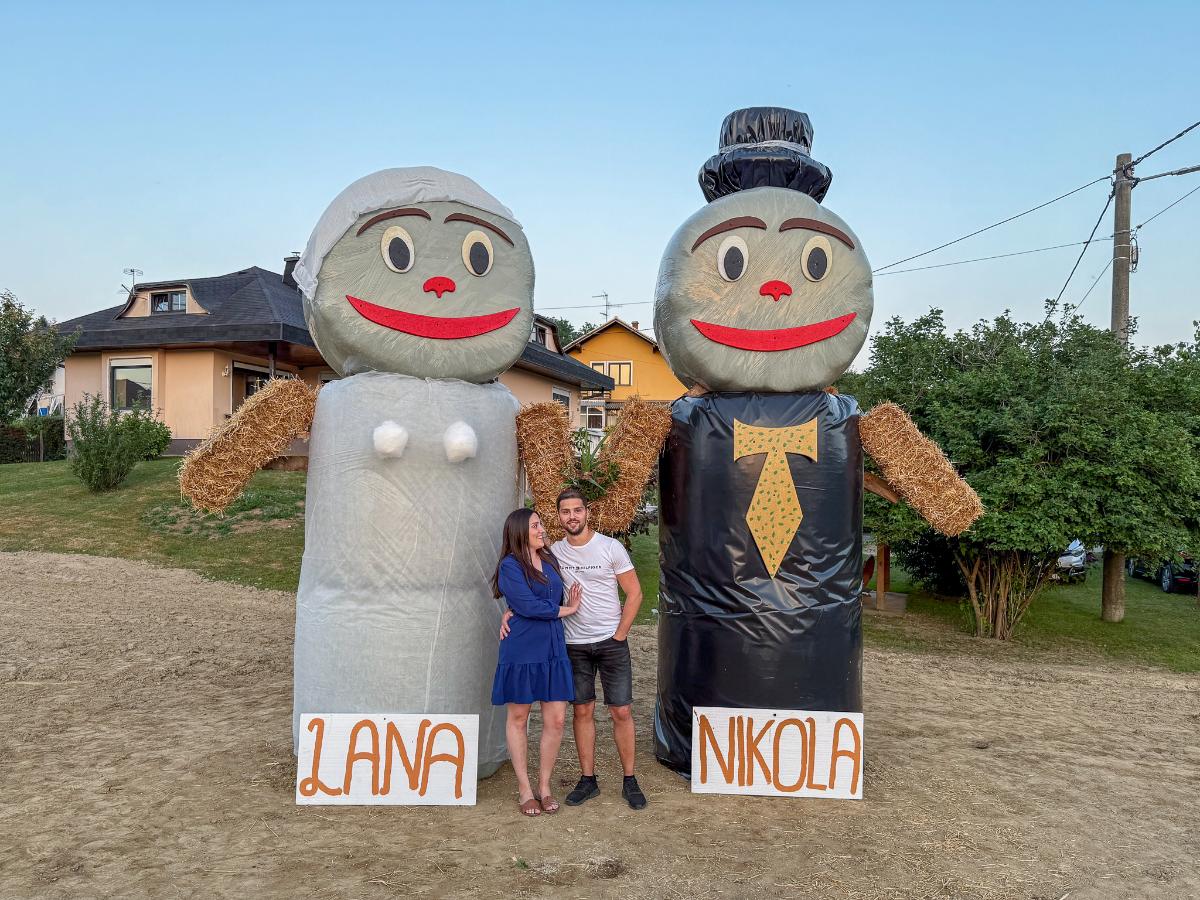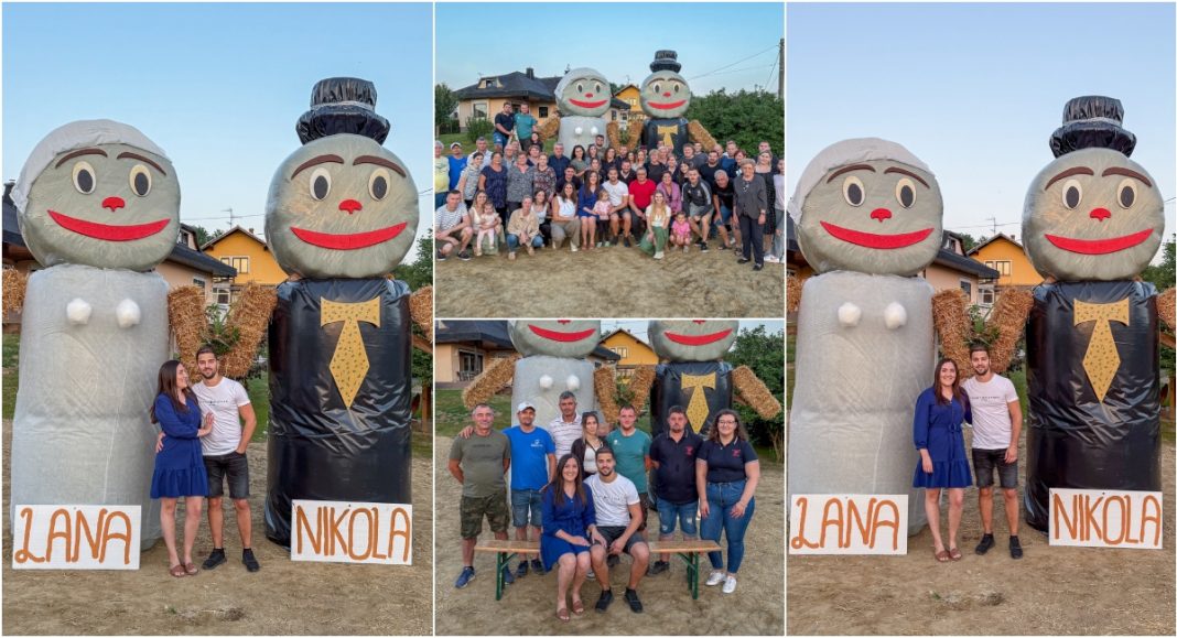 Ovaj put iznenađenje su priredili za zaručnike Lanu Slamek iz Peklenice i Nikolu Borka iz Štrigove, koji će u srpnju ove godine izreći sudbonosno “da”. U dvorištu budućih mladenaca osvanule su velike figure od slame – simpatične maskote koje simboliziraju mladenku i mladoženju.