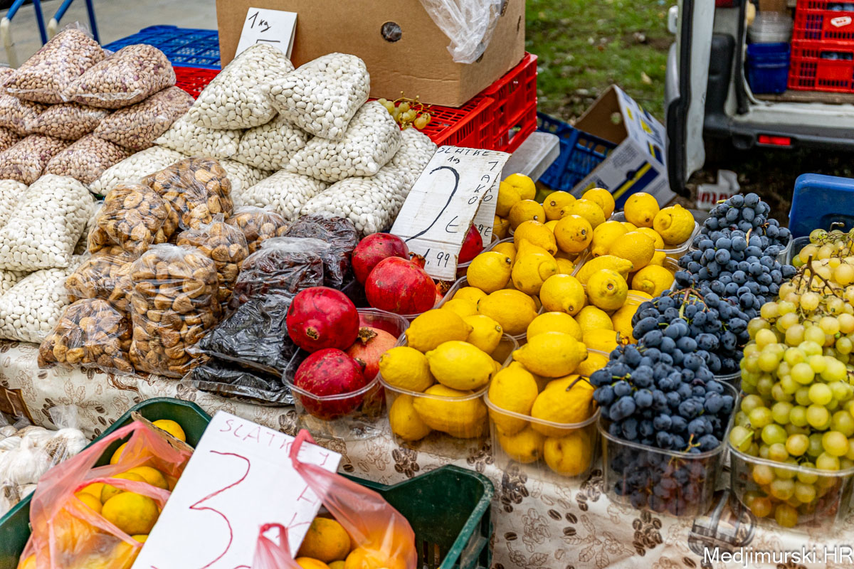 Očišćeni orasi nuđeni su čak po 16 eura kilogram. Breske su po 3 eura kg. Marelice su nuđene po 1 euro, šljive po 2 i 3 eura, jabuke stare po 1 euro kg, a ovogodišnje do 1,50 eura kilogram, limun po 3, grožđe po 2 i 3, kruške po 3, a datulje, suhe šljive i suhe smokve po 5 eura kilogram.