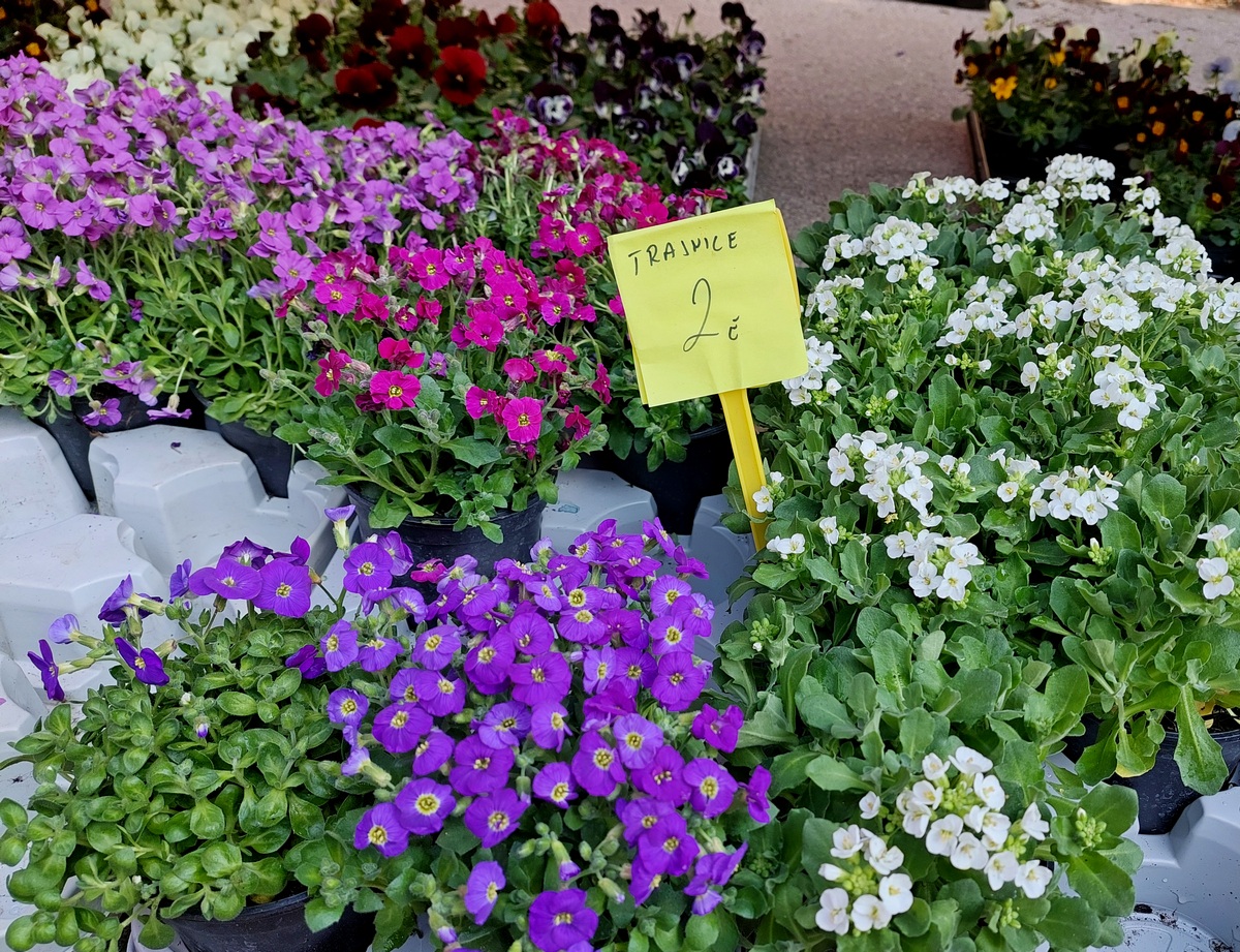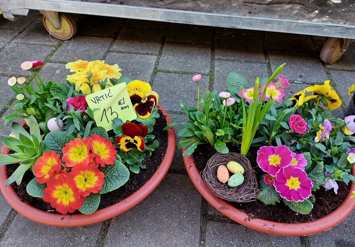 Ovdje ćete pronaći sadnice proljetnog cvijeća u raznim bojama, od jaglaca (1,50 eura), zumbula (2 eura), tratinčica (0,70 – 1 euro), karanfila (1,50 – 3 eura) do maćuhica (0,60 eura) i cikama (3 eura).