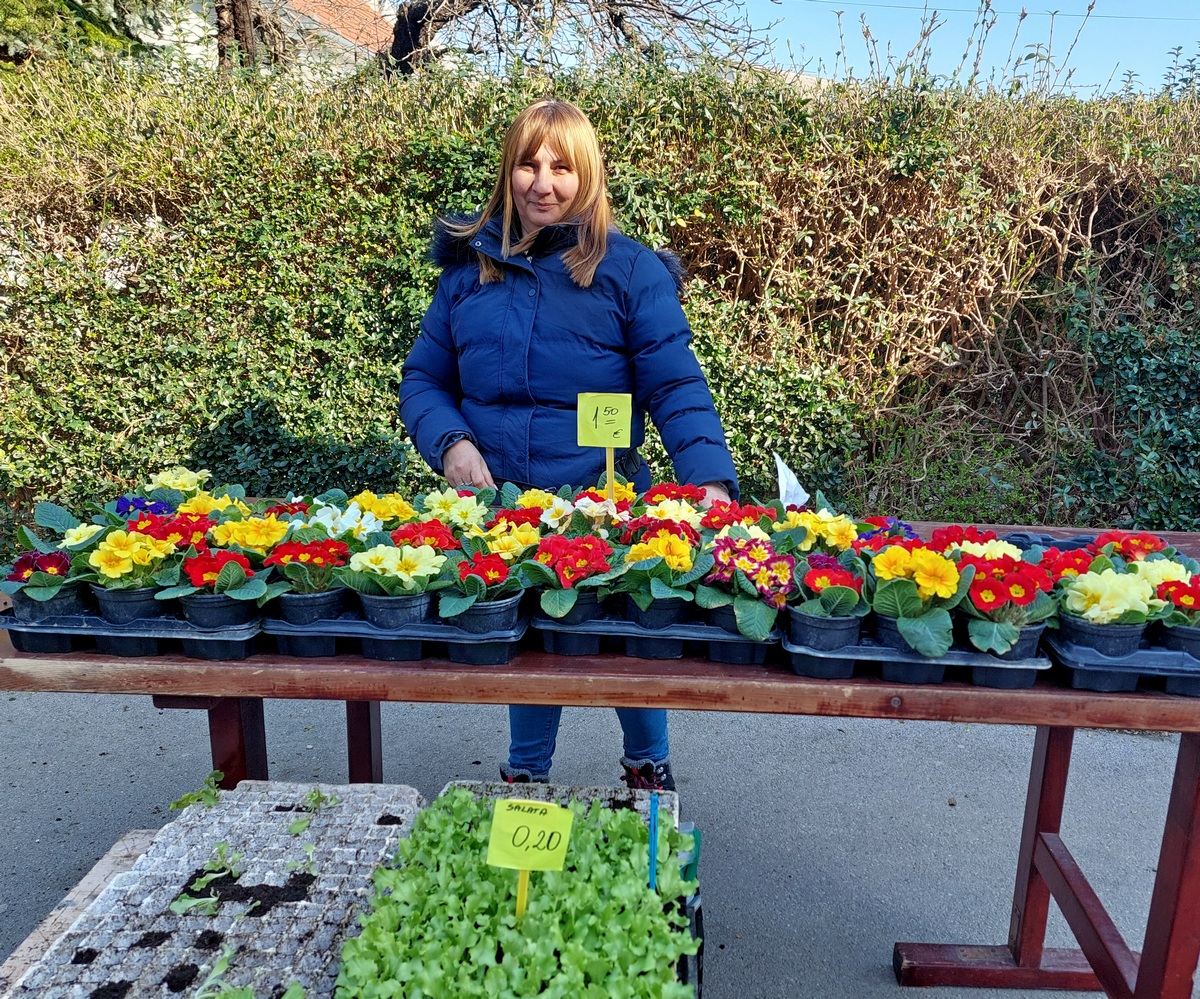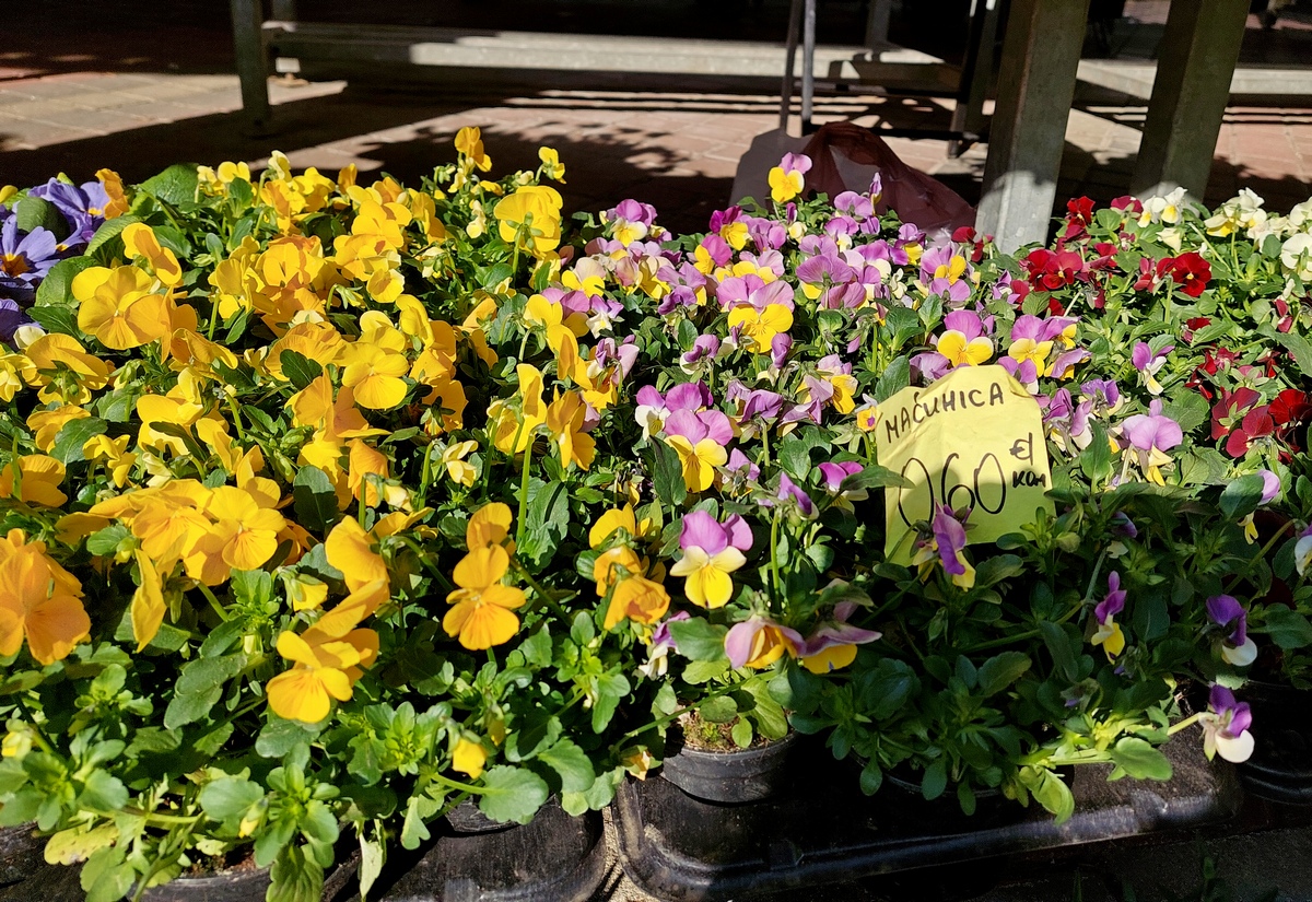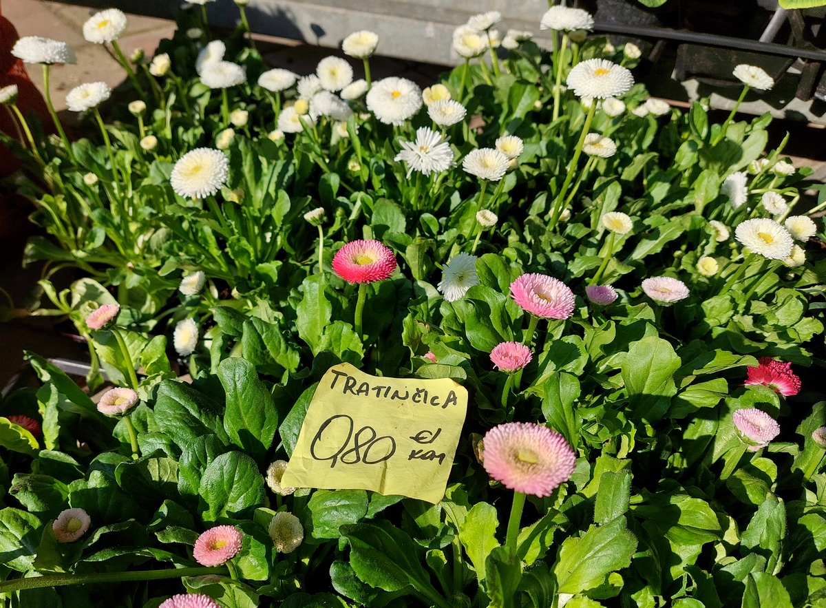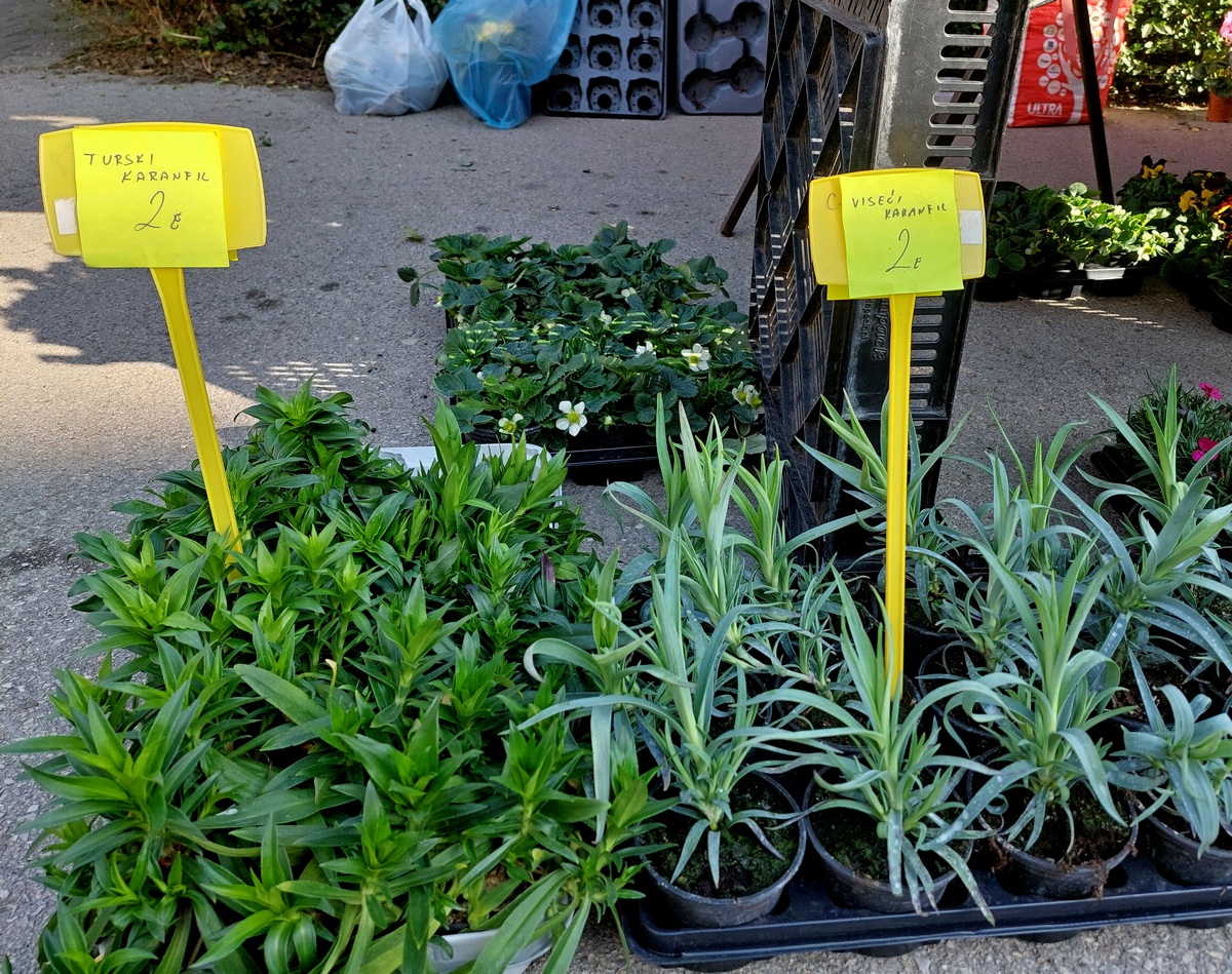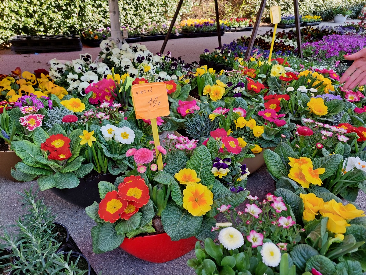 Ovdje ćete pronaći sadnice proljetnog cvijeća u raznim bojama, od jaglaca (1,50 eura), zumbula (2 eura), tratinčica (0,70 – 1 euro), karanfila (1,50 – 3 eura) do maćuhica (0,60 eura) i cikama (3 eura).