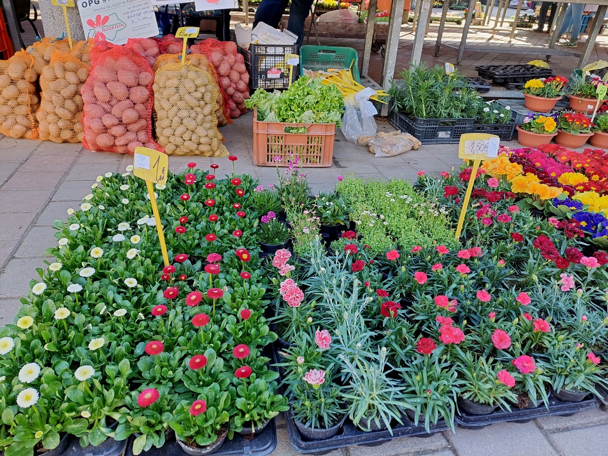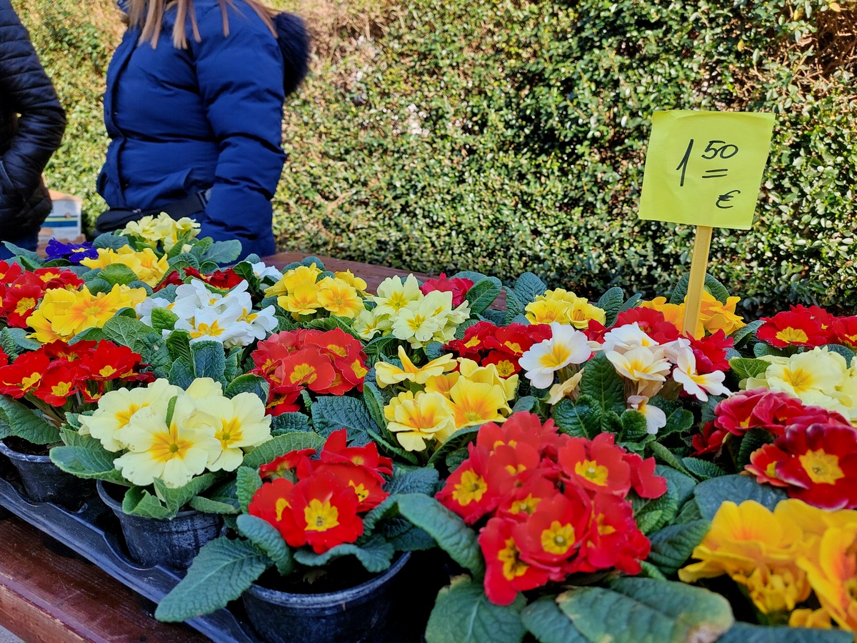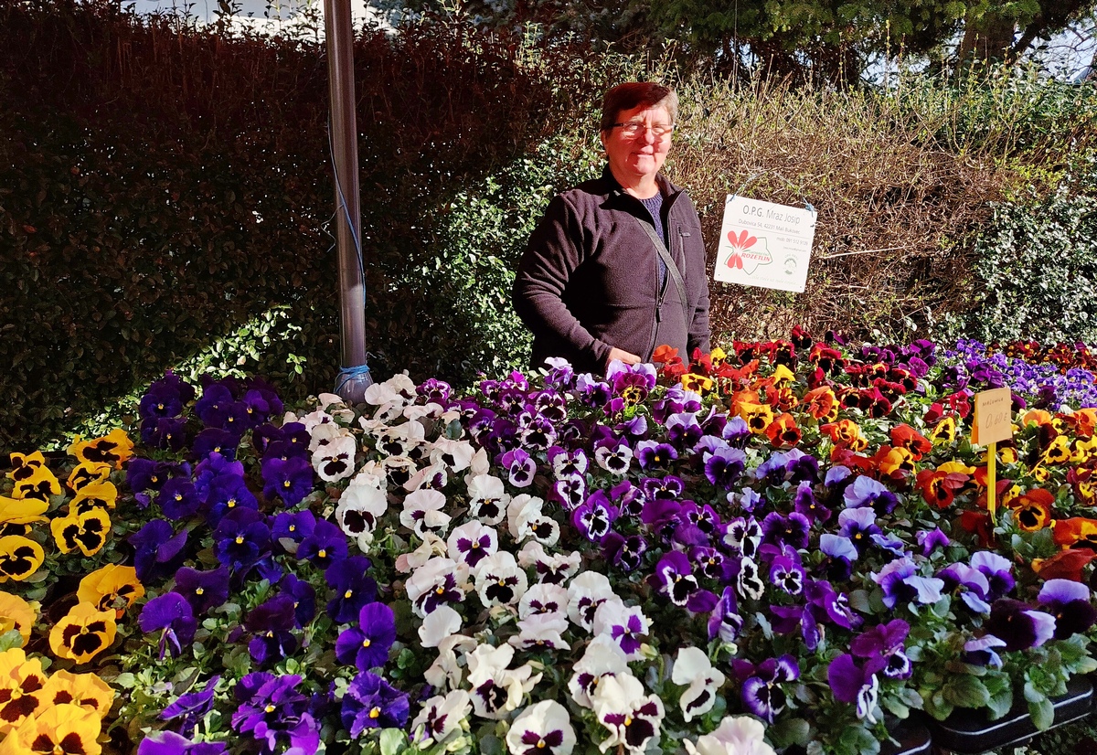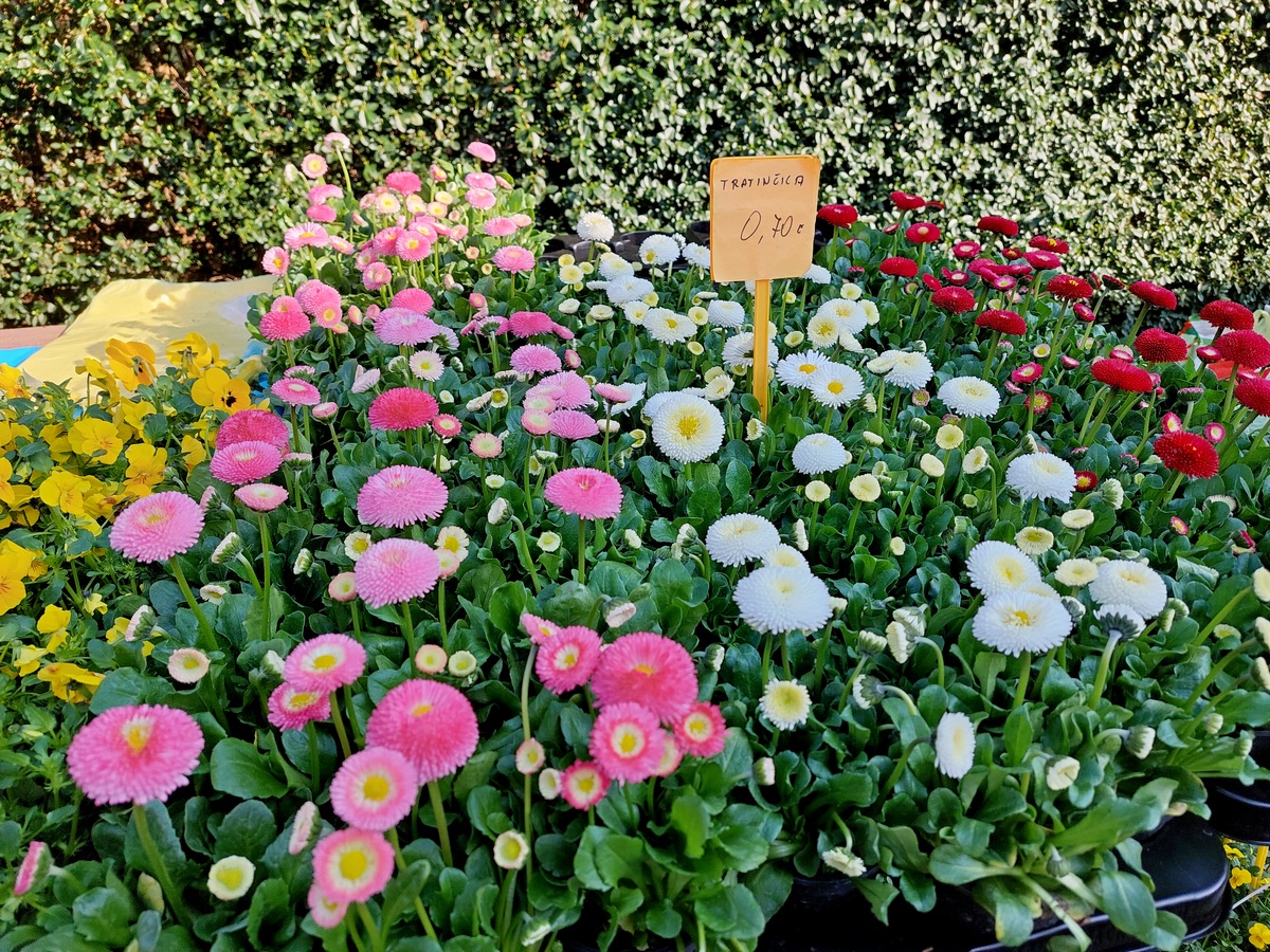 Ovdje ćete pronaći sadnice proljetnog cvijeća u raznim bojama, od jaglaca (1,50 eura), zumbula (2 eura), tratinčica (0,70 – 1 euro), karanfila (1,50 – 3 eura) do maćuhica (0,60 eura) i cikama (3 eura).