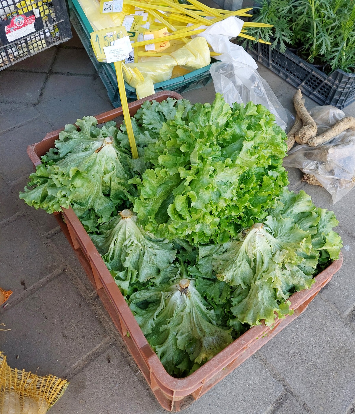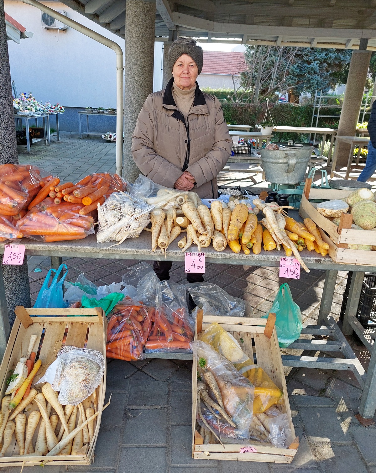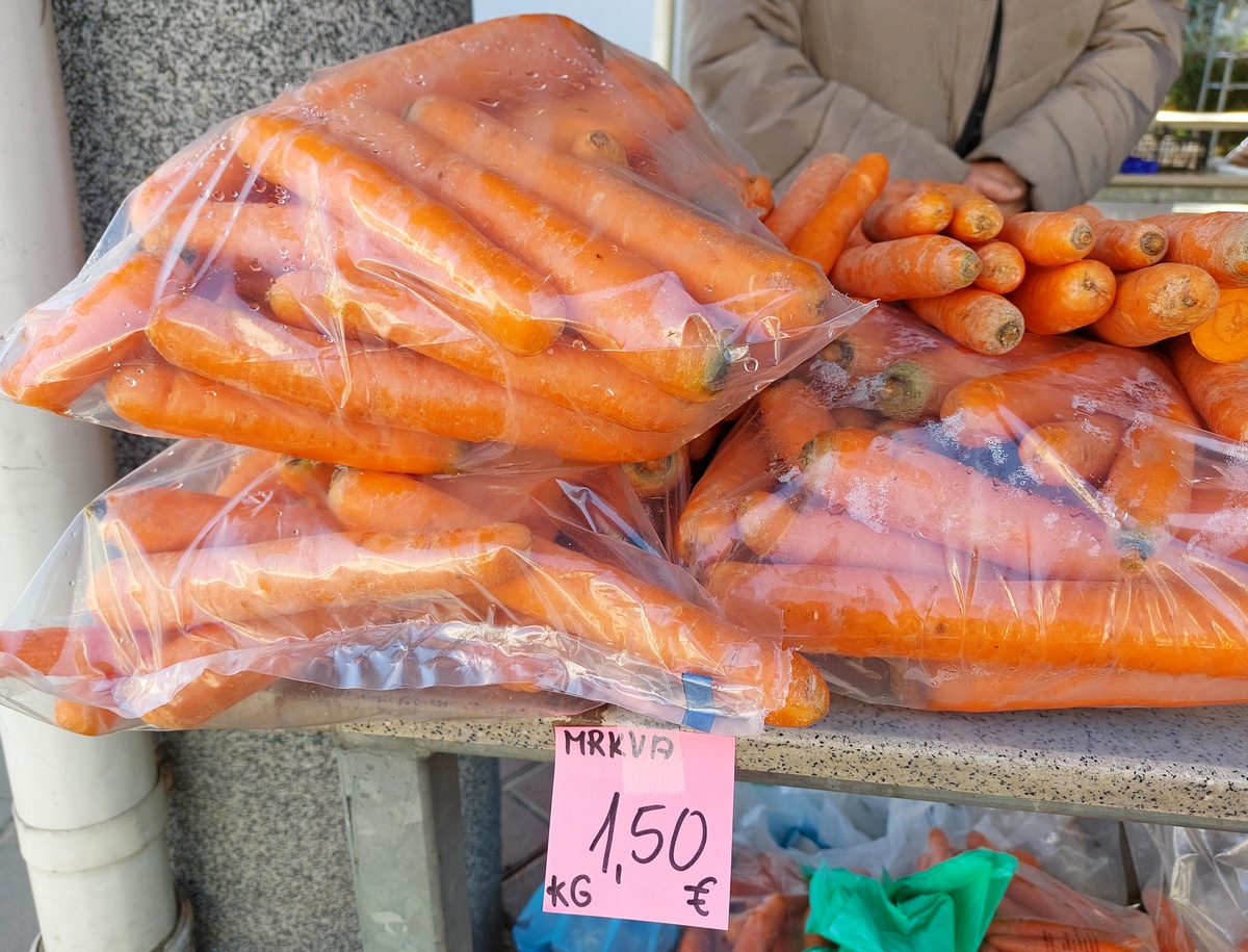 Krumpir u pakiranju od 10 kg prodaje se po cijeni do 6 do 10 eura, ovisno o sorti, glavica zelene salate kristalke 1,50 eura, zatim zelje i mrkva za 1,50 eura po kilogramu, vezica mladog luka 1,50 eura, paketić za grincajg 1,50 eura, celer 2 eura po kilogramu, pasternjak 4 eura po kilogramu te poriluk i kelj za 3 eura po kilogramu. Tu je i matovilac u pakiranju od 150 grama za 1,50 eura.