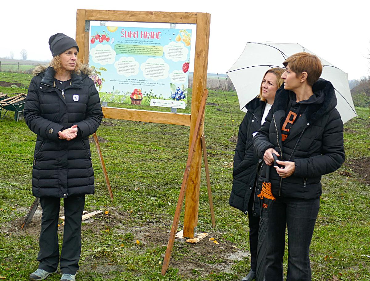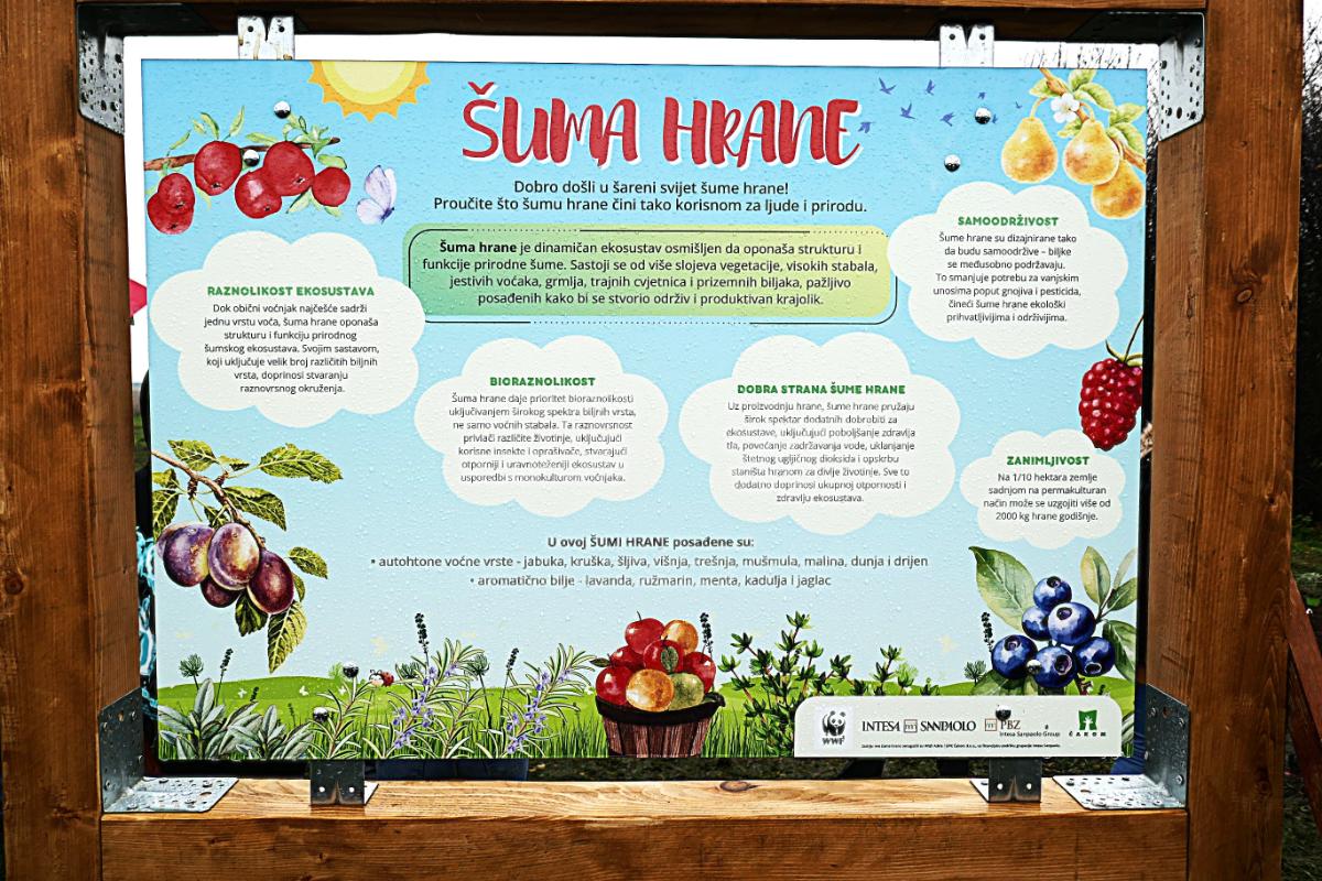 Šuma hrane je dinamičan ekosustav dizajniran da oponaša strukturu i funkcije prirodne šume. Čini je više katova vegetacije, visoka stabla, jestive voćne vrste, grmovi, trajne cvjetnice i prizemne biljke, koje su pažljivo odabrane kako bi se stvorio održiv i produktivan ekosustav. Tako samoodrživ ekosustav olakšava život i ljudima i planetu, jer su plodovi i sjemenke voćaka istovremeno i hrana za mnoge životinjske vrste, istakla je tom prilikom Petra Boić Petrač, direktorica komunikacija u WWF Adriji.