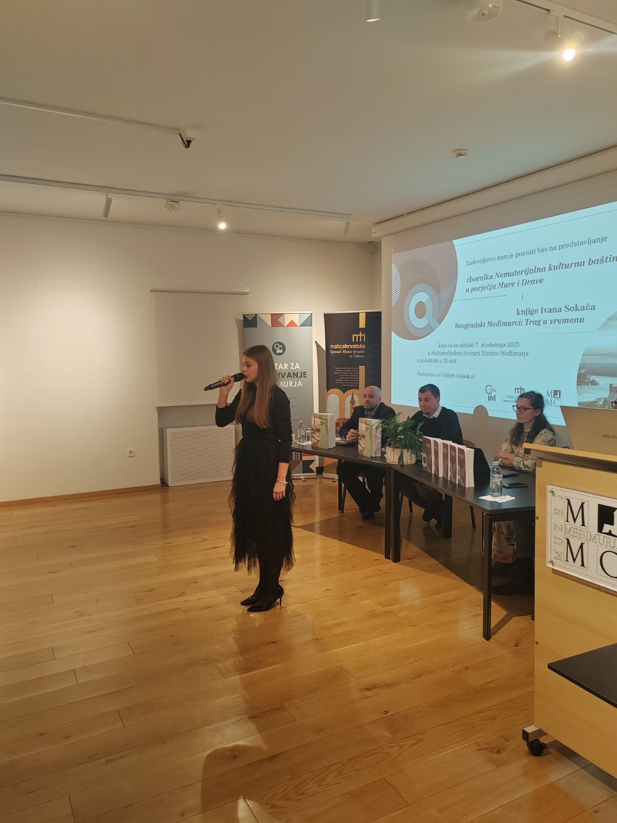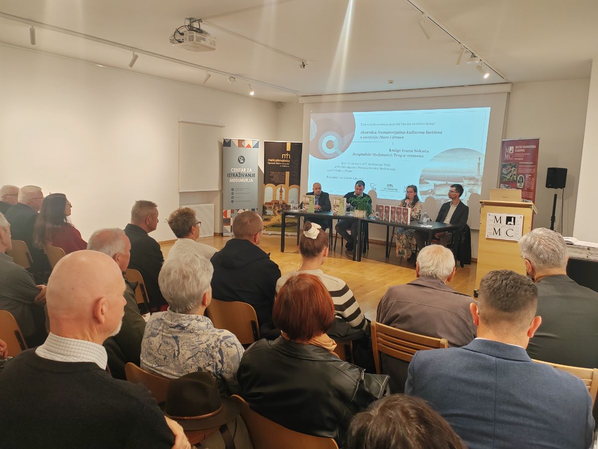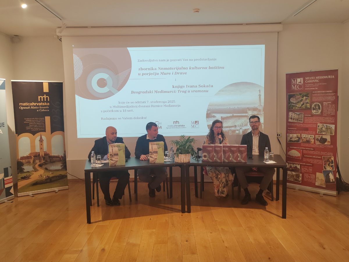 Prvi dio večeri započeo je predstavljanjem zbornika radova s prvoga međunarodnog znanstvenog skupa Centra za istraživanje Međimurja naslovljenog „Nematerijalna kulturna baština u porječju Mure i Drave“. Urednica Janja Kovač ukratko je podsjetila na razloge odabira takve teme skupa 2023. godine, odnosno predstavila 14 znanstvenih i stručnih radova sabranih među njegovim koricama, a koji pokrivaju niz zanimljivih tema, od običaja pripreme preloškog klecinprota do prikaza rada raznih institucija diljem zemlje koje se bave čuvanjem baštine. Kao predstavnik recenzenata Anđelko Vlašić istaknuo je važnost održavanja skupova i objavljivanja zbornika te pojasnio recenzijski postupak.