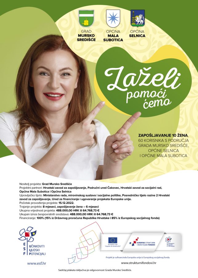 Projekt „Zaželi – pomoći ćemo“ provodi se na području grada Mursko Središće, općine Mala Subotica i općine Selnica u razdoblju od 8 mjeseci počevši od 15.12.2022. godine.