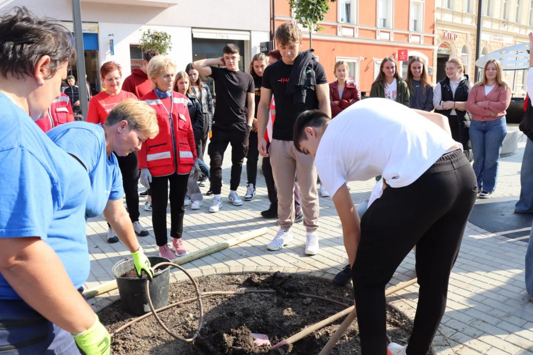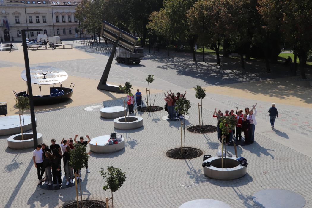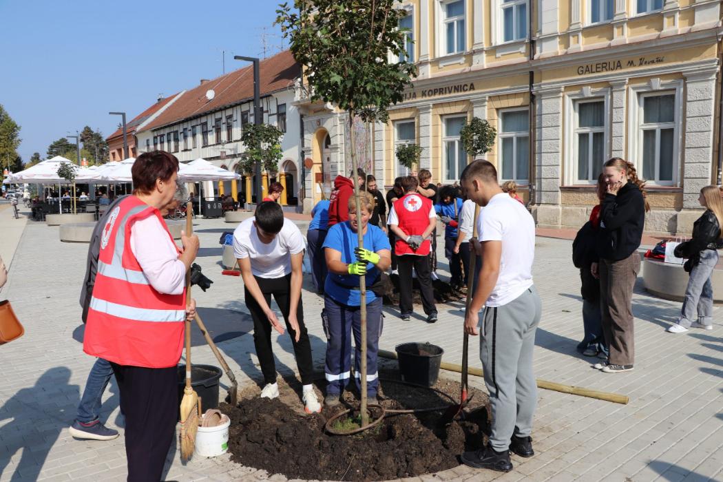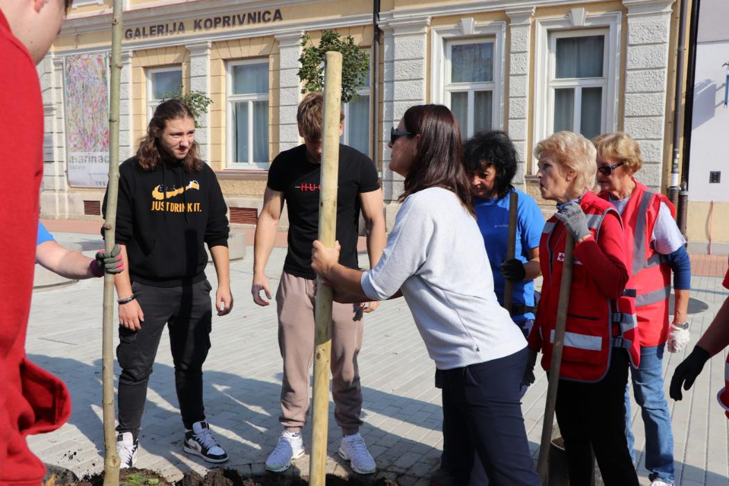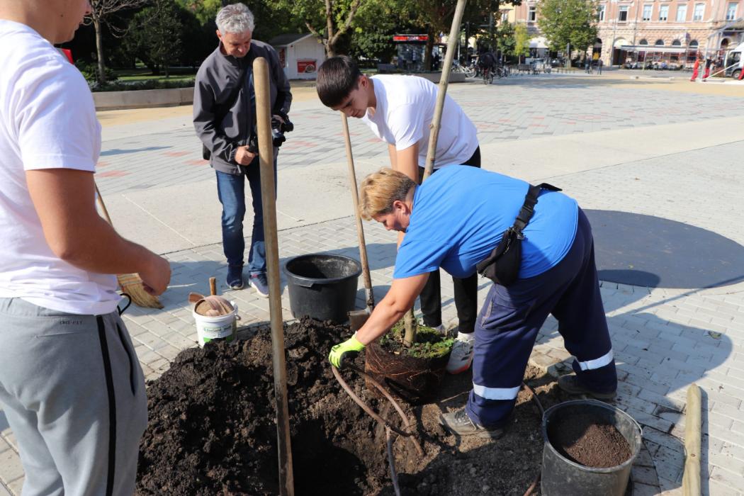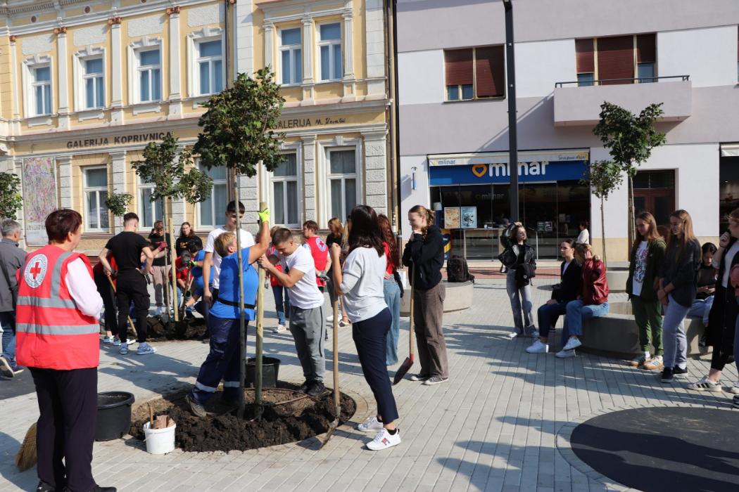 Učenici 4.b razreda Gimnazije Fran Galović sa svojom razrednicom Kristinom Bukvić i djelatnicima Komunalca obilježili su Europski tjedan mobilnosti sadnjom novih stabala koja će krasiti Zrinski trg.
