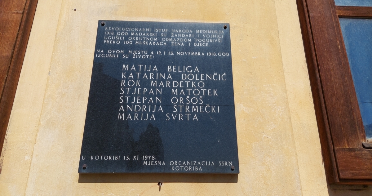 U ovoj zgradi u prošlosti su bili smješteni općina, zatvor, policija, škola, vrtić… Mnogim je mještanima prirasla srcu, a i povijesni je spomenik. U toj je kući davne 1918. godine od strane Mađara živote izgubilo sedmero stanovnika Kotoribe, a njihova imena isklesana su na spomen ploči na fasadi zgrade 1978. godine. Nikad nije proglašena zaštićenim objektom. Do urušavanja su po njoj bili nalijepljeni plakati koji upozoravaju stanovnike da crijep može pasti s krova i da se ne zadržavaju u njezinoj blizini. Prostorije ove zgrade, koja se nalazi uz sportsi teren, povremeno su koristili Malonogometni klub Klub 75 te Košarkaški klub Kotoriba.