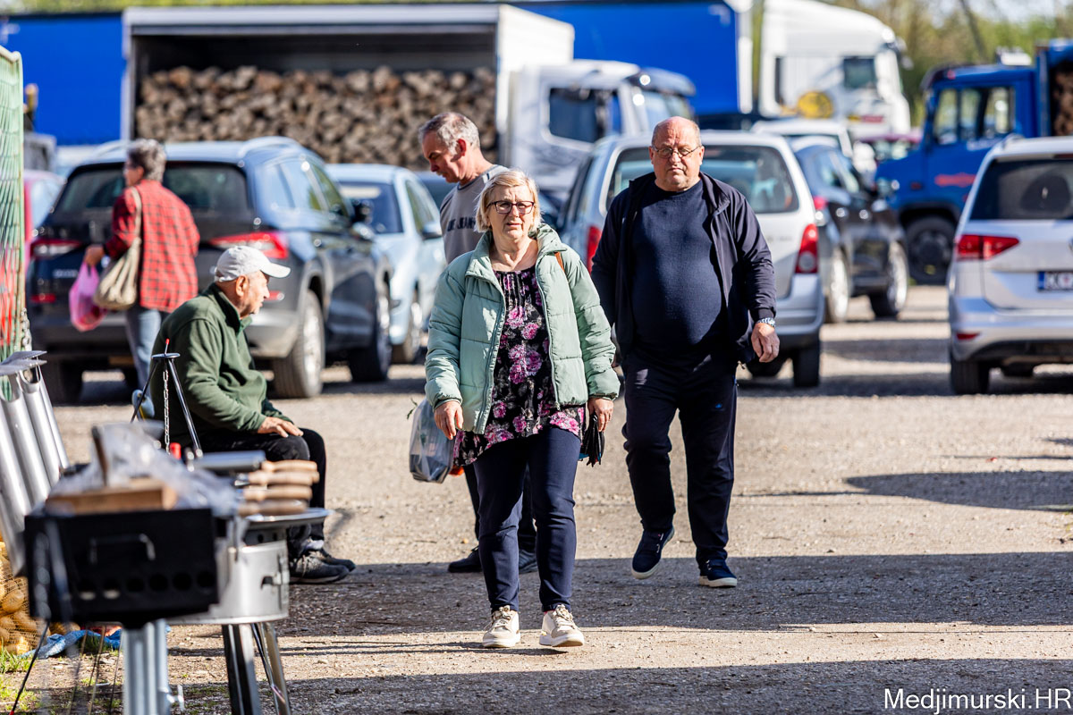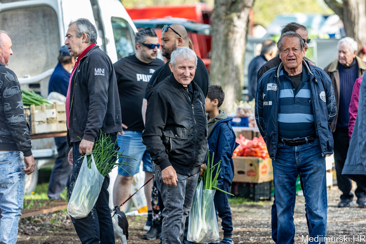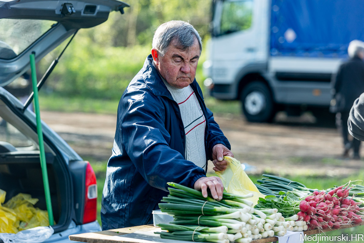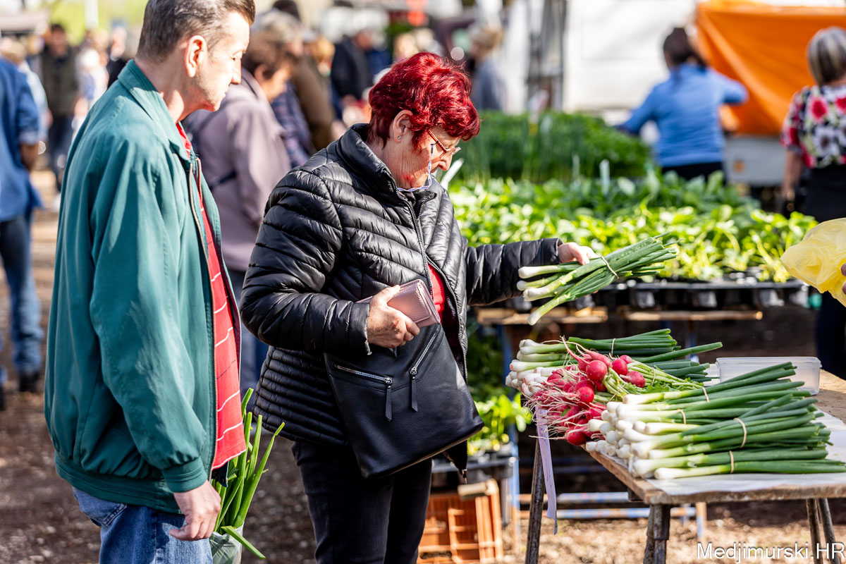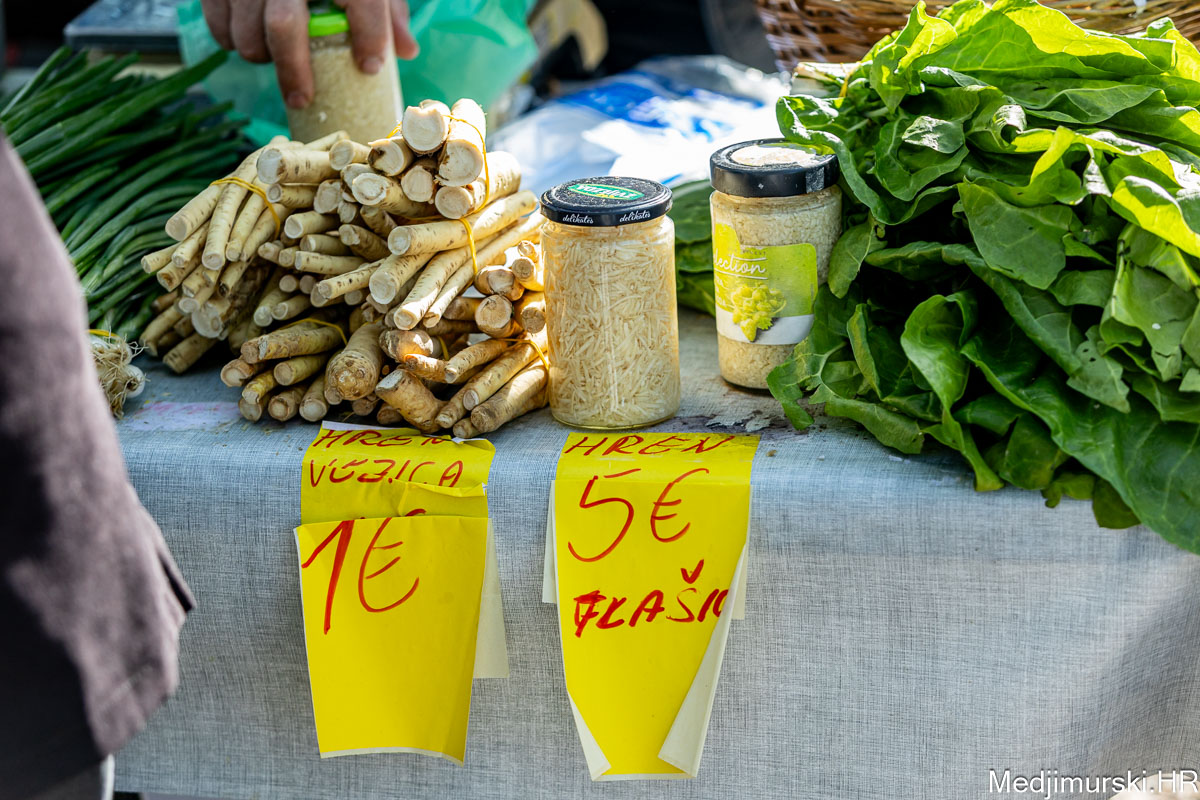 I danas je bilo puno ljudi na čakovečkom sajmu srijedom. Dobro se kupovalo i prodavalo. Posebno namirnice za uskrsni stol. Hren je bio po 5 eura kilogram, vezica sitnijeg korijena hrena 1 euro, a naribani hren u staklenki 5 eura. Mladi luk također je prodavan po 5 eura kg, a vezica mladog luka po 1 euro. Poriluk je nuđen po 2 eura kg. Po 1 euro bile su i vezice crvene rotkvice i blitve.
