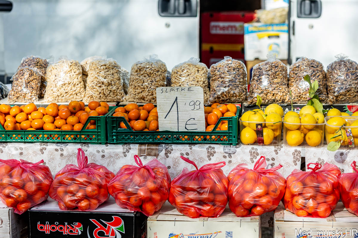 Mandarine, nektarine i naranče su po 2 euro kilogram. Jabuke su bile od 1 do 1,50 eura kilogram, limun po 3, grožđe po 2,5, kruške citronke po 3, datulje i suhe šljive po 5 eura kg, a suhe smokve po 4 i 5 eura kilogram.