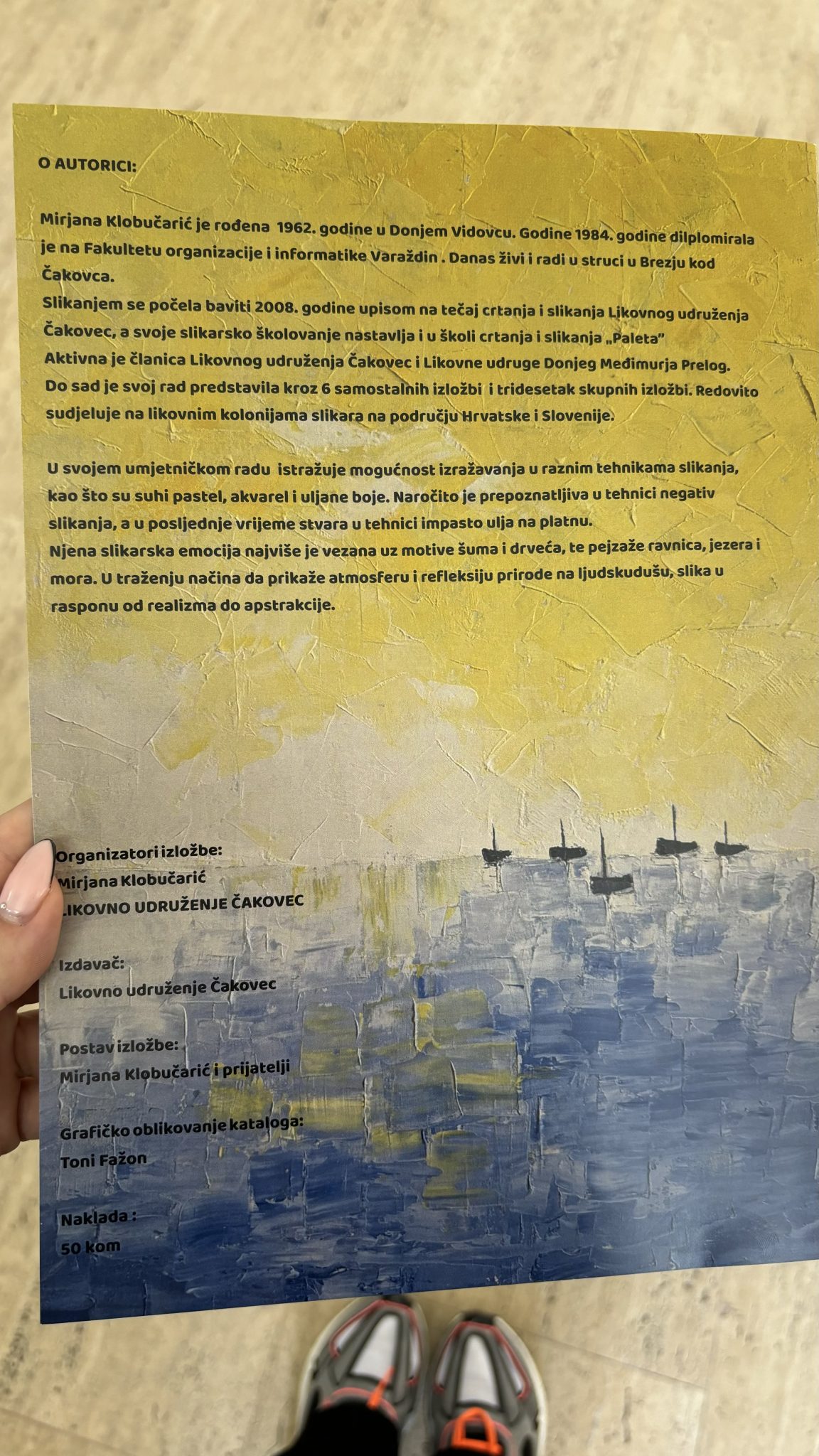 Jučer, 18. rujna 2024. godine u zgradi Scheier, otvorena je sedma samostalna izložba prepoznate umjetnice Mirjane Klobučarić naziva “Slobodan ulaz.” Klobučarić je rođena 1962. godine u Donjem Vidovcu, s današnjom adresom u Brezju. Slikanjem se počela baviti 2009. godine upisavši tečaj crtanja i slikanja Likovnog udruženja Čakovec, a svoje je školovanje nastavila u školi crtanja i slikanja “Paleta.”
