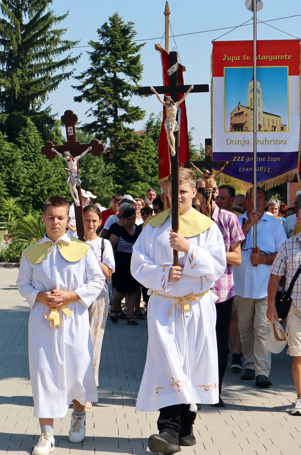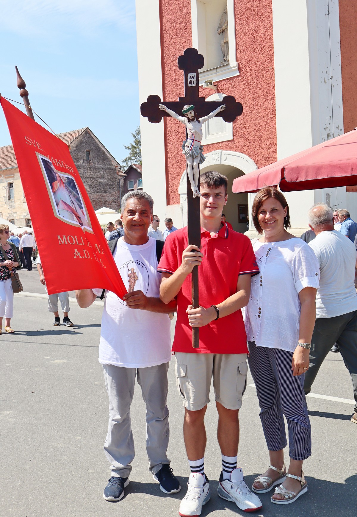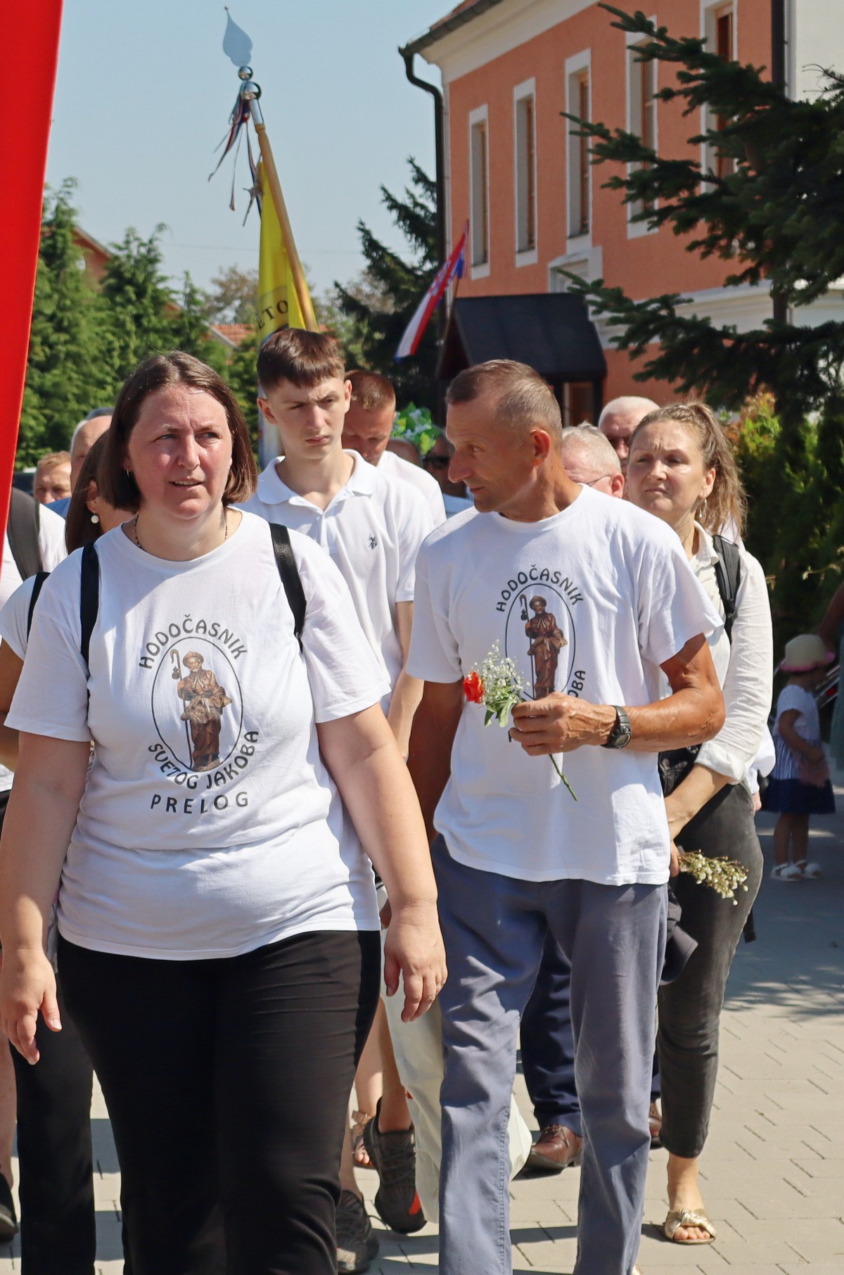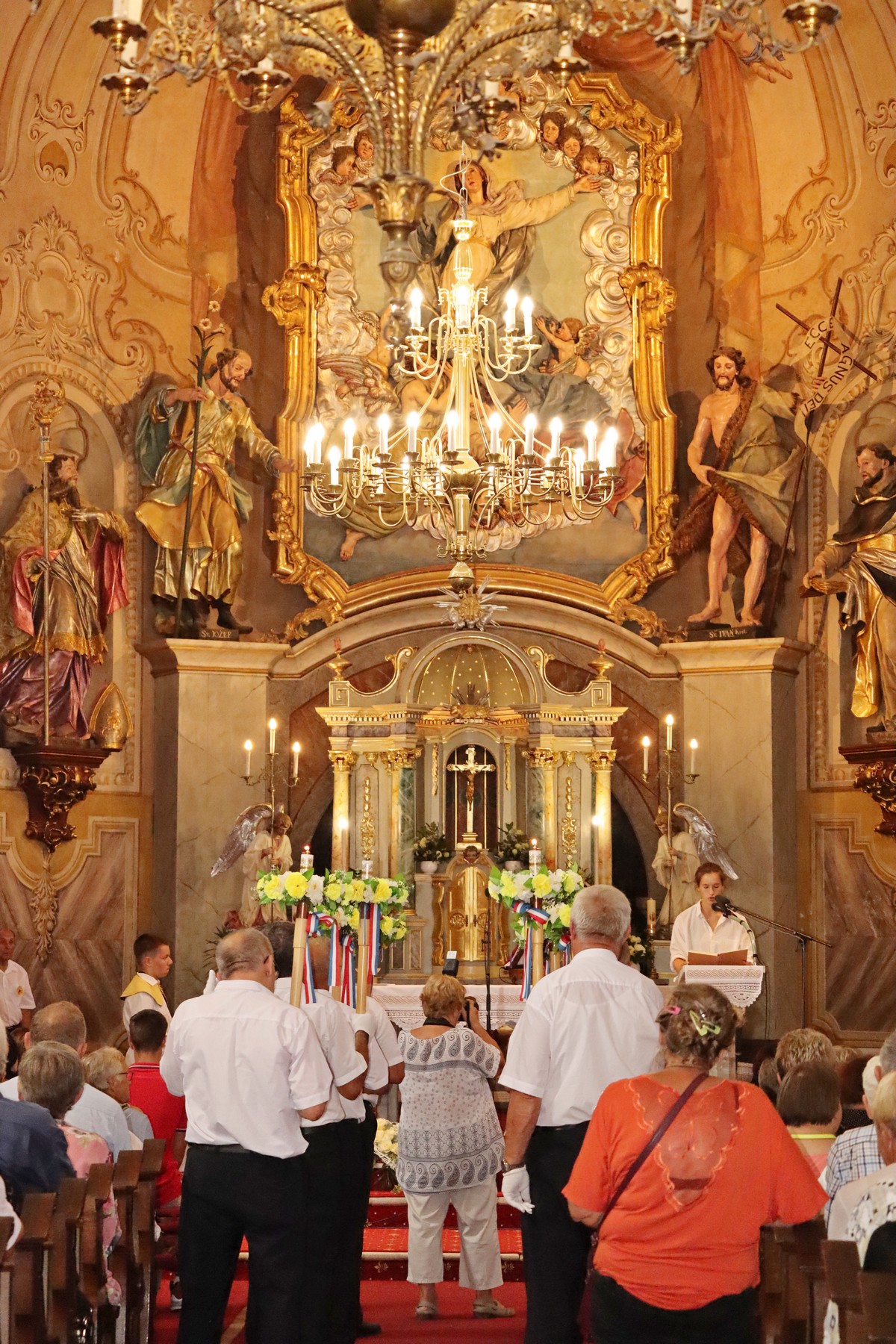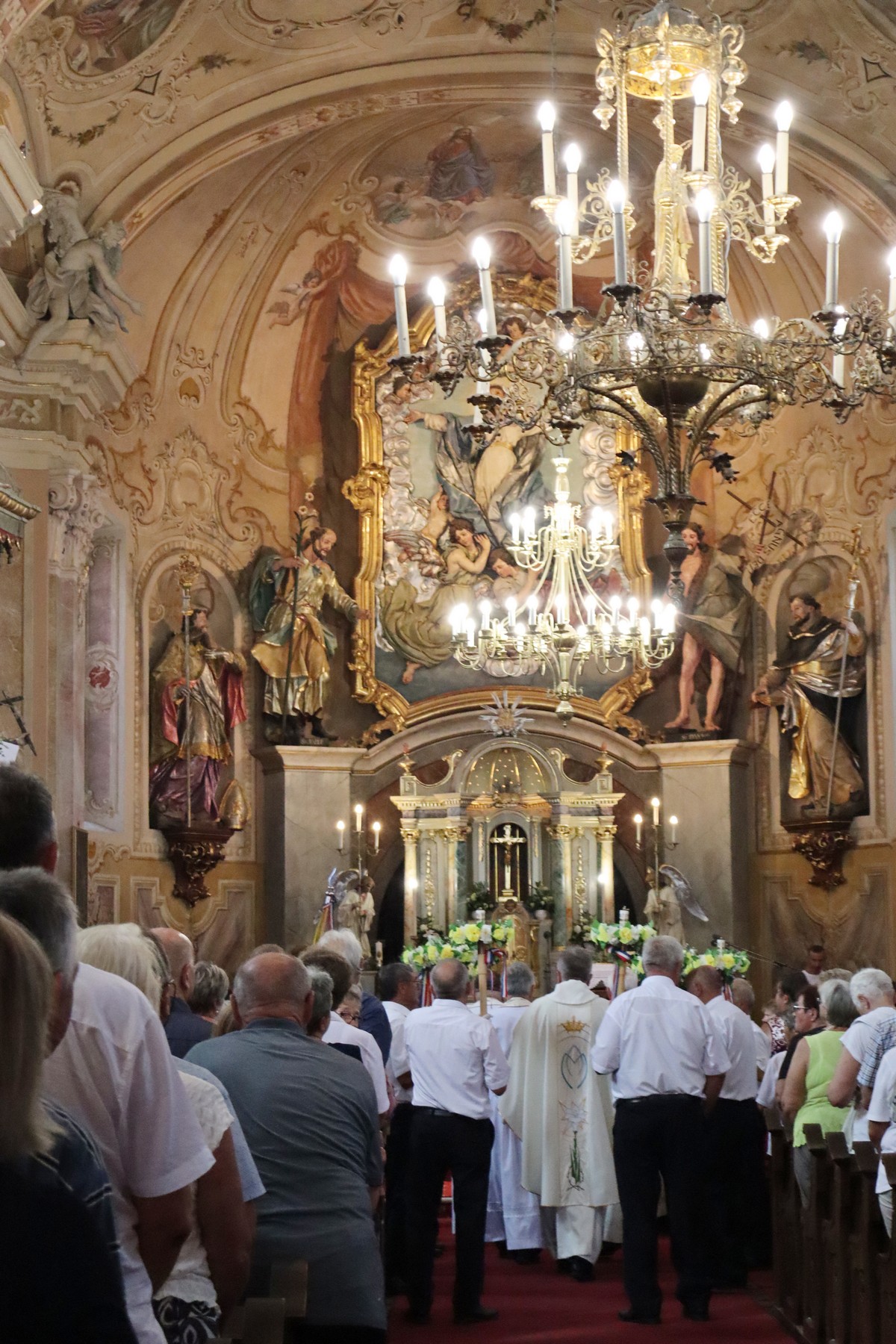 Povorka hodočasnika okupila se u dvorištu farofa na osvježenju i zakusci, nakon čega su krenuli u crkvu Uznesenja Blažene Djevice Marije na Hodočasničku svetu misu u 11 sati, koju je predvodio prečasni Antun Štefan, župnik iz Štefanca.
